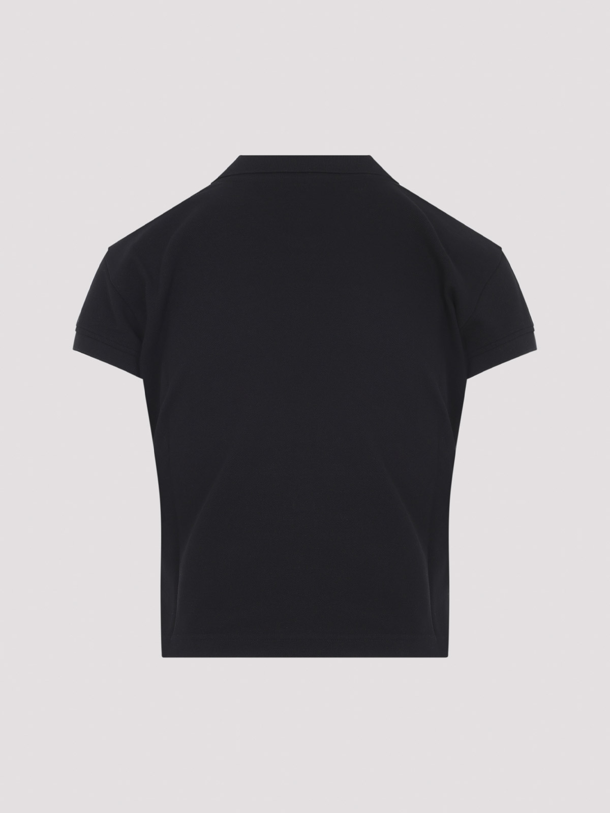 Balenciaga SS ブラックコットンポロシャツ。ブラックコットンピケ製で、先のとがった襟、2つのボタン留め、前面にコントラストの効いたロゴ刺繍、半袖、サイドベンツ、長いバックヘムが特徴です。