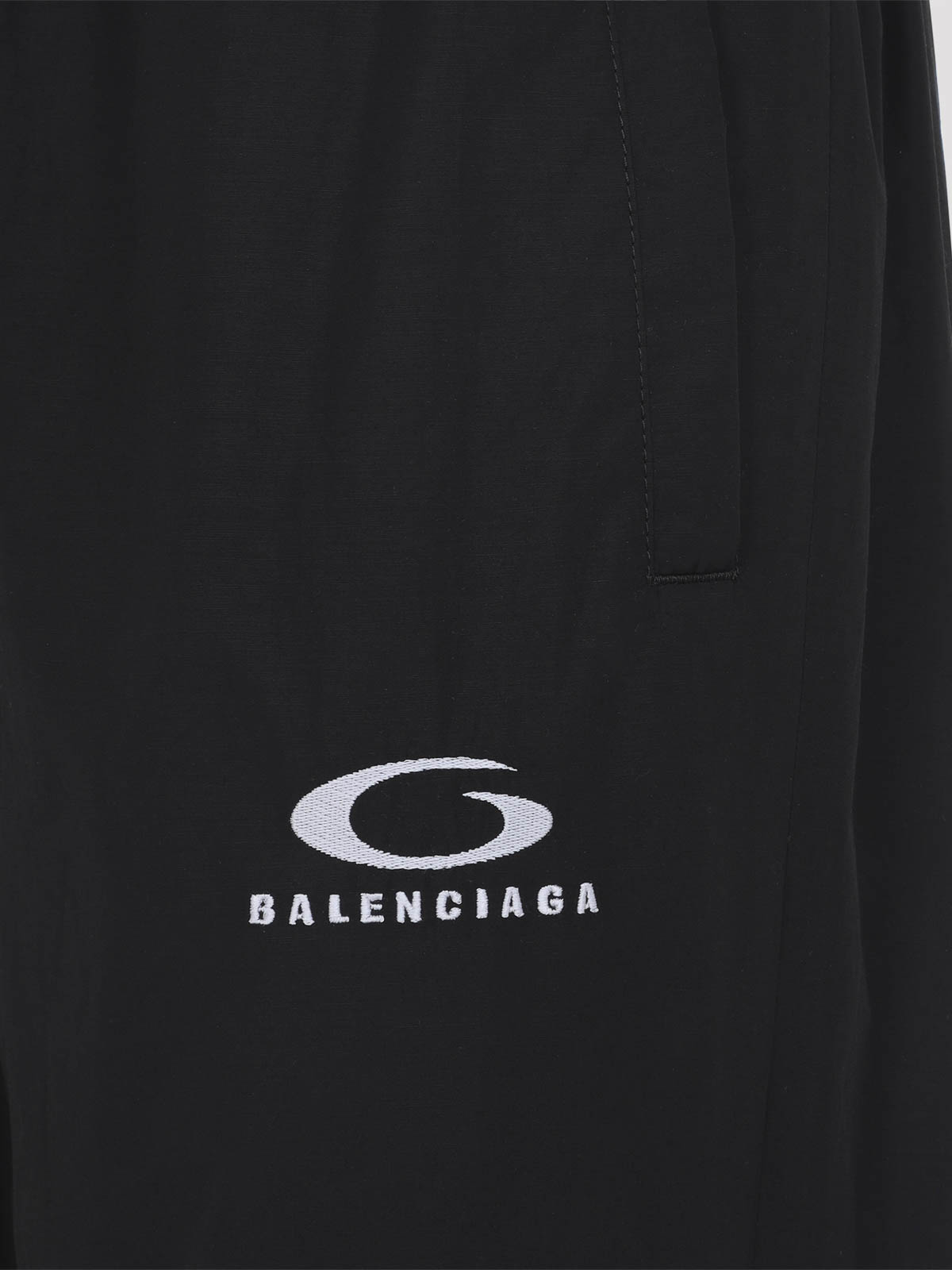 Balenciaga ブラックコットントラックパンツ。ブラックコットン混紡素材で、伸縮性のあるウエスト、サイドポケット、コントラストの効いた白いロゴ刺繍、伸縮性のある袖口が特徴です。