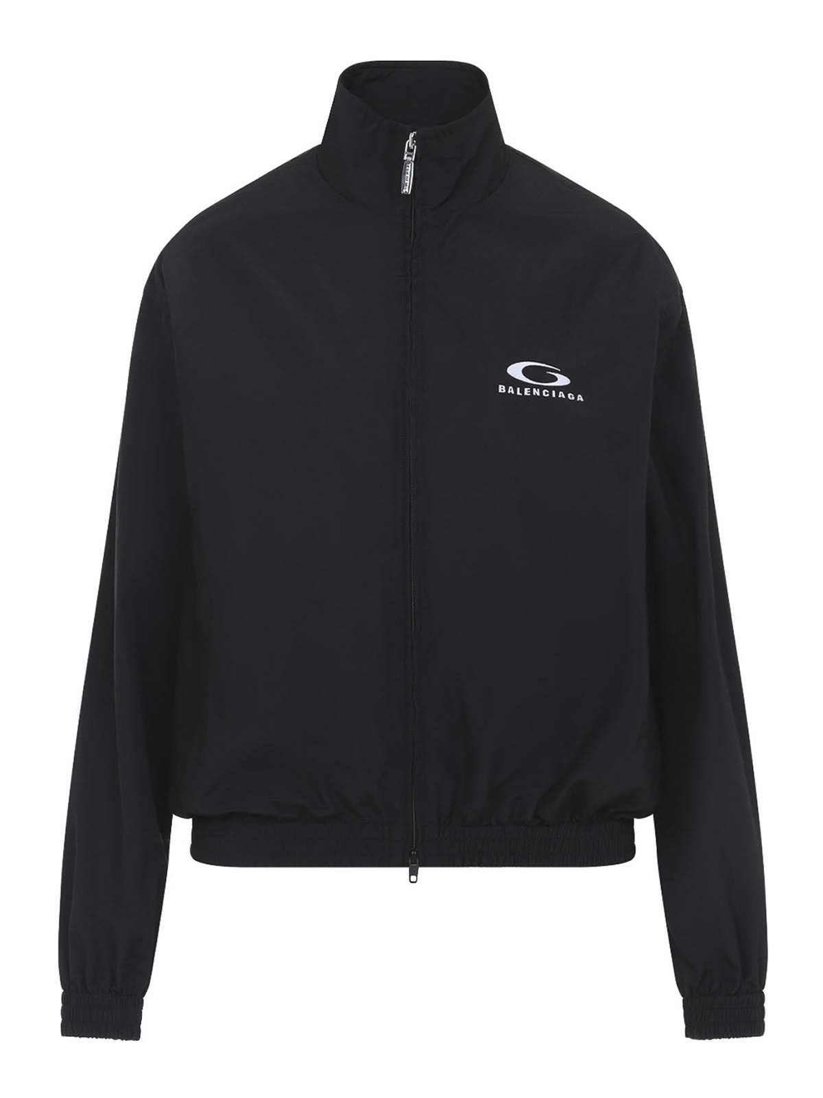 Balenciaga ブラックコットンジャケット。ブラックコットンブレンド製で、スタンドカラー、ツーウェイジッパー、胸と背面にコントラストの効いた白いロゴ、サイドポケット2つ、ドロップショルダー、ロングスリーブ、伸縮性のある袖口と裾が特徴です。
