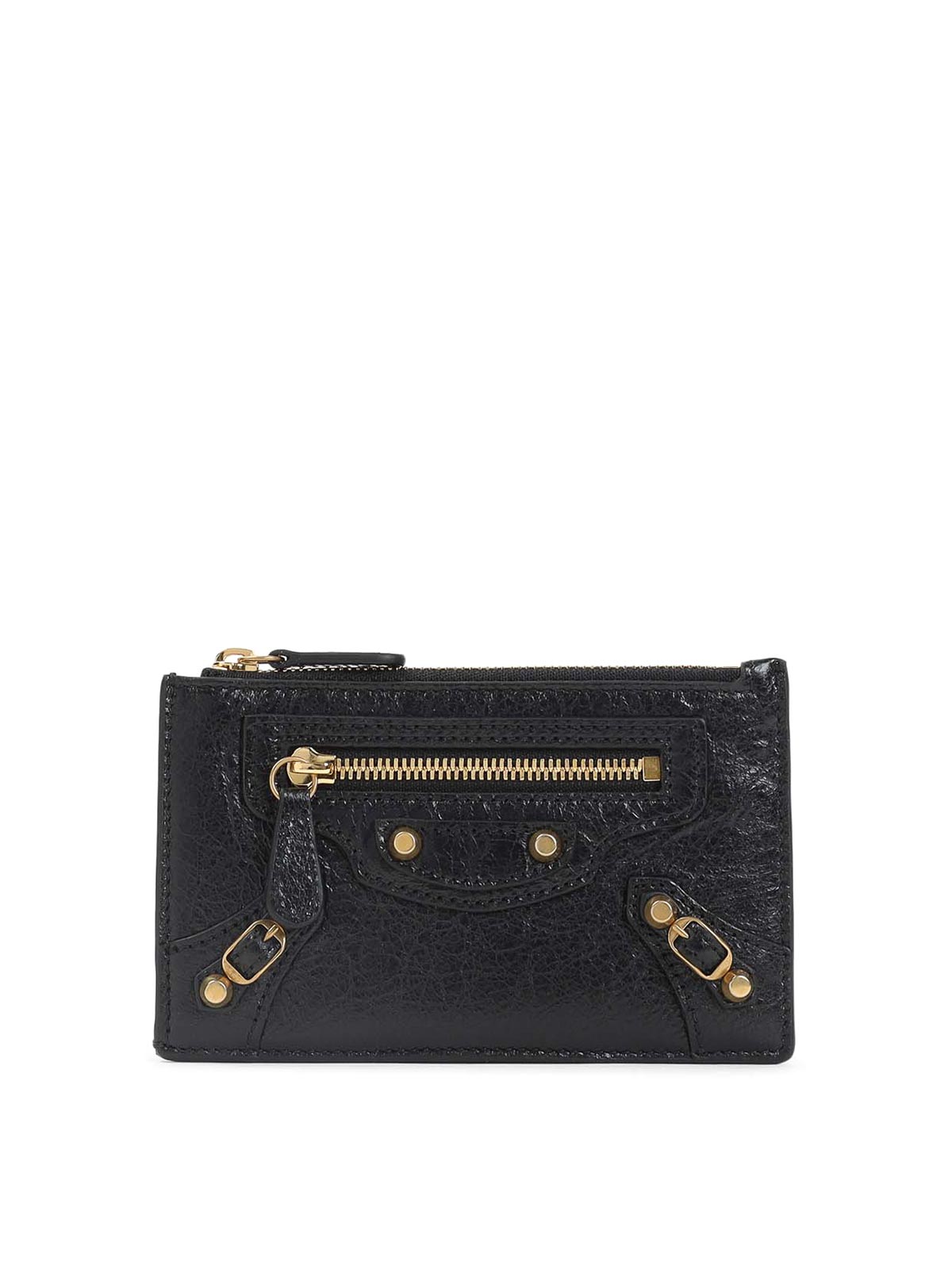 バレンシアガブラックラムレザールシティロングカードホルダー。ピュアブラックラムレザーカードホルダー、上部ファスナー開閉、フロントジッパーディテール、フロントゴールドトーンのスタッズディテール、サイドゴールドトーンのメタリックバックル、バックビルコンパートメント、バック5枚のカードスロット。ゴールドトーンの金具。