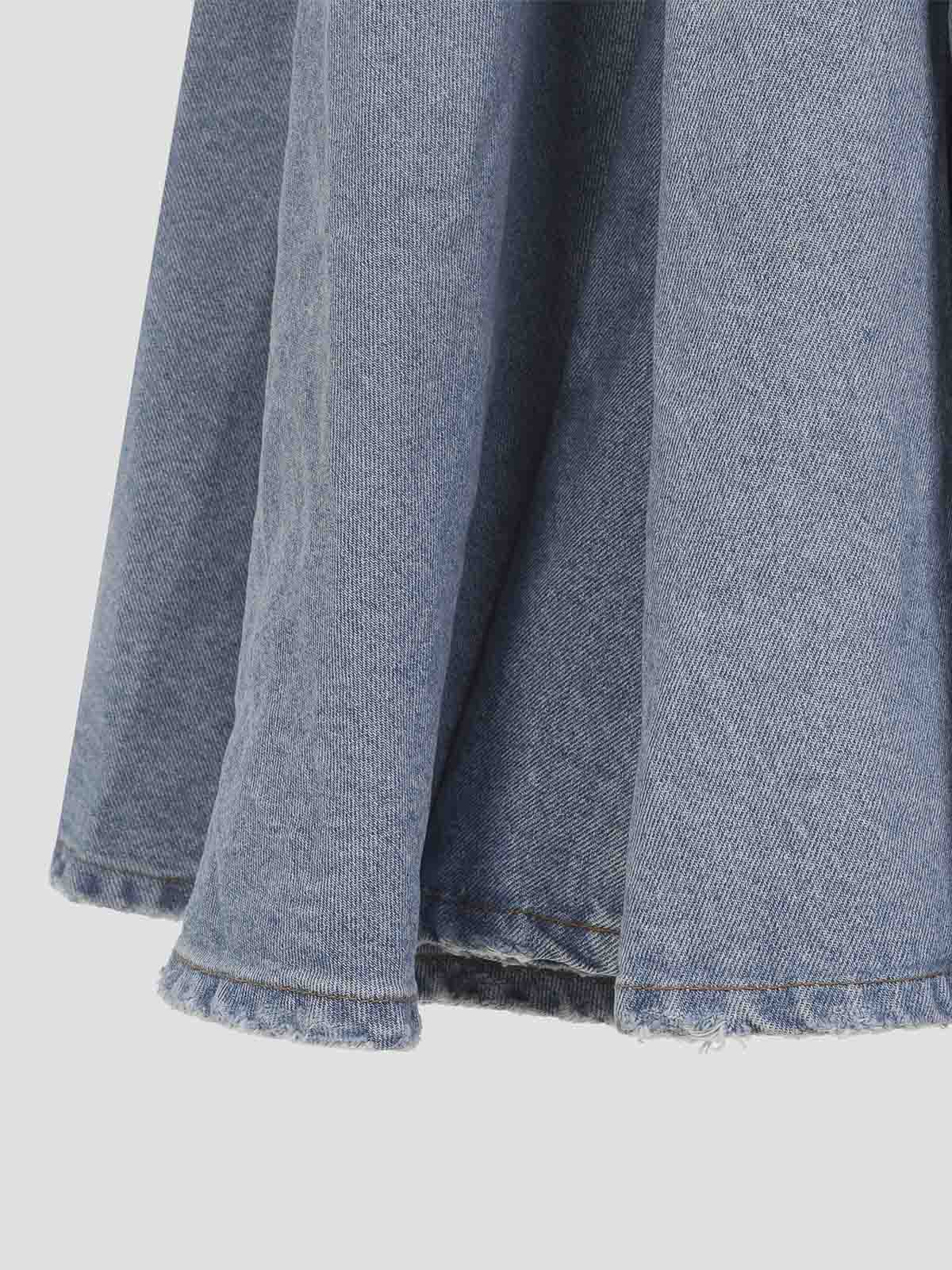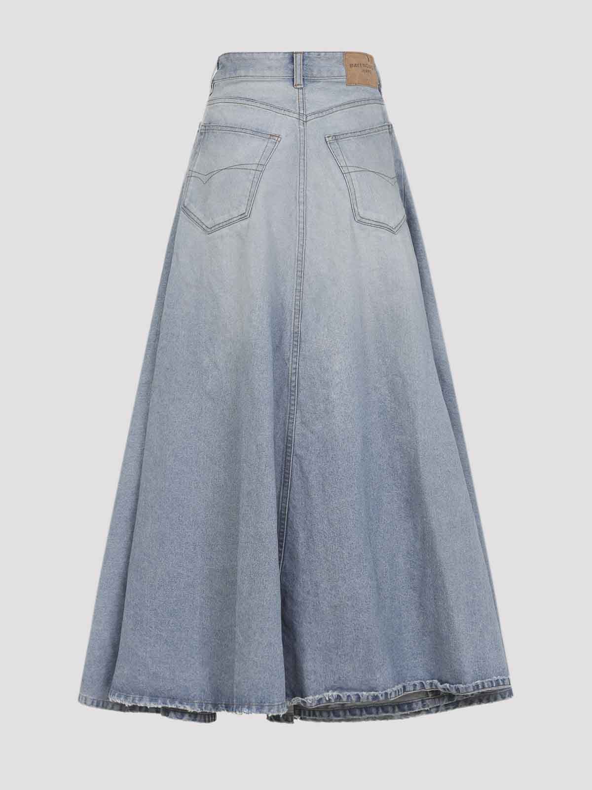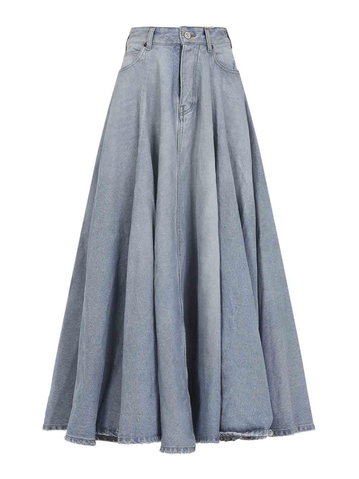 バレンシアガゴデットライトブルーコットンロングスカート。ウォッシュ加工のライトブルーコットンデニムで作られたゴデット構造のマキシスカート。ミッドウエスト、ベルトループ、5ポケット構造、フロントボタンとジップフライファスナー、バックにブランドラベルが付いています。