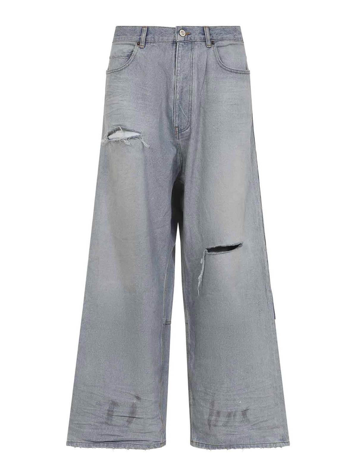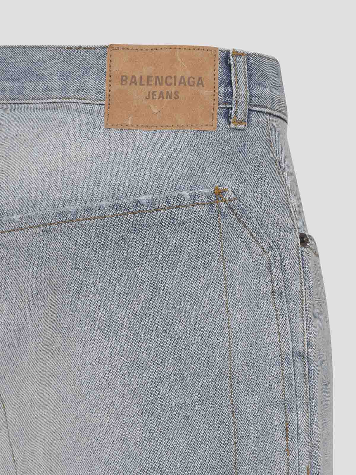 バレンシアガのミニマルバギーライトブルーコットンパンツ。ライトブルーのコットンデニム製で、ミッドウエスト、ベルトループ、5ポケット構造、フロントボタンとジップフライファスナー、ウエストの後ろにブランドラベル、ゆったりとしたワイドレッグが特徴です。