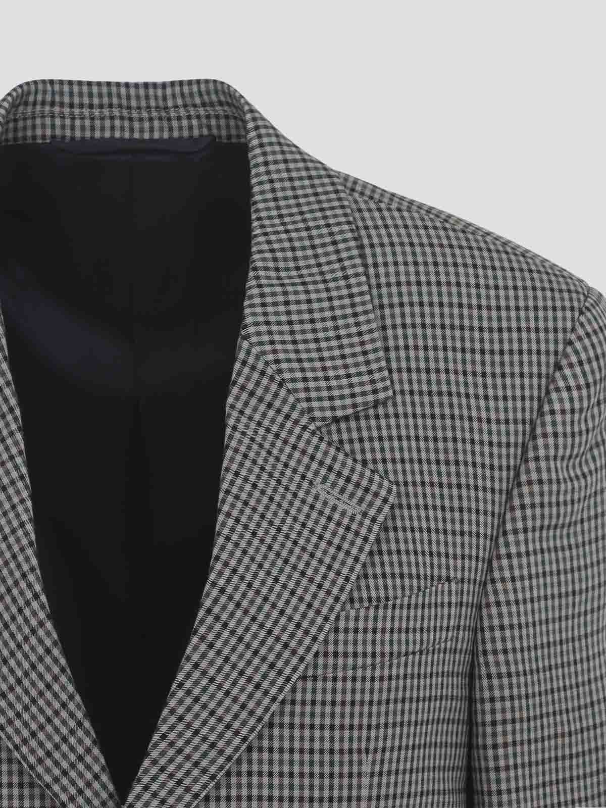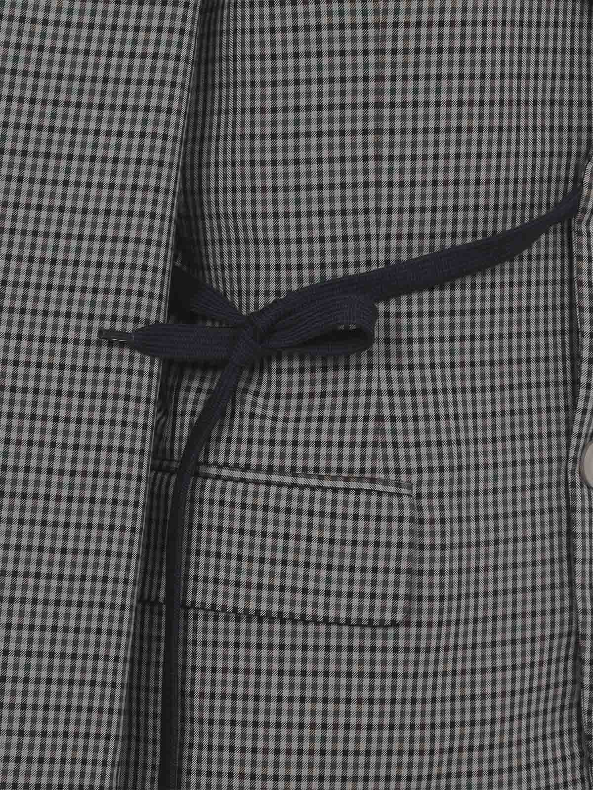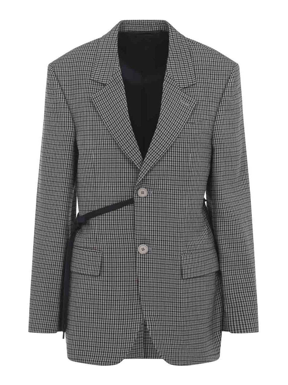 バレンシアガラップテーラードカーキリヨセルジャケット。カーキの市松模様のリヨセル製で、切り欠きのある襟、シングルブレスト構造、フロントに2つのボタン留め、ウエストにドローコード、パッド入りの肩、ボタン付きカフス付きの長袖、後ろの中央に通気口、総裏地が特徴です。