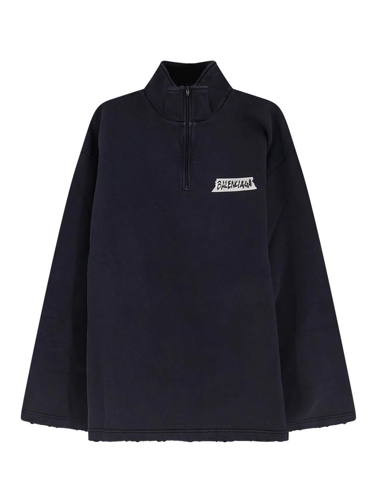 ハイカラー、ハーフジッパー、ロングスリーブ、フロントロゴプリント、ユーズドエフェクト、100% コットン。
