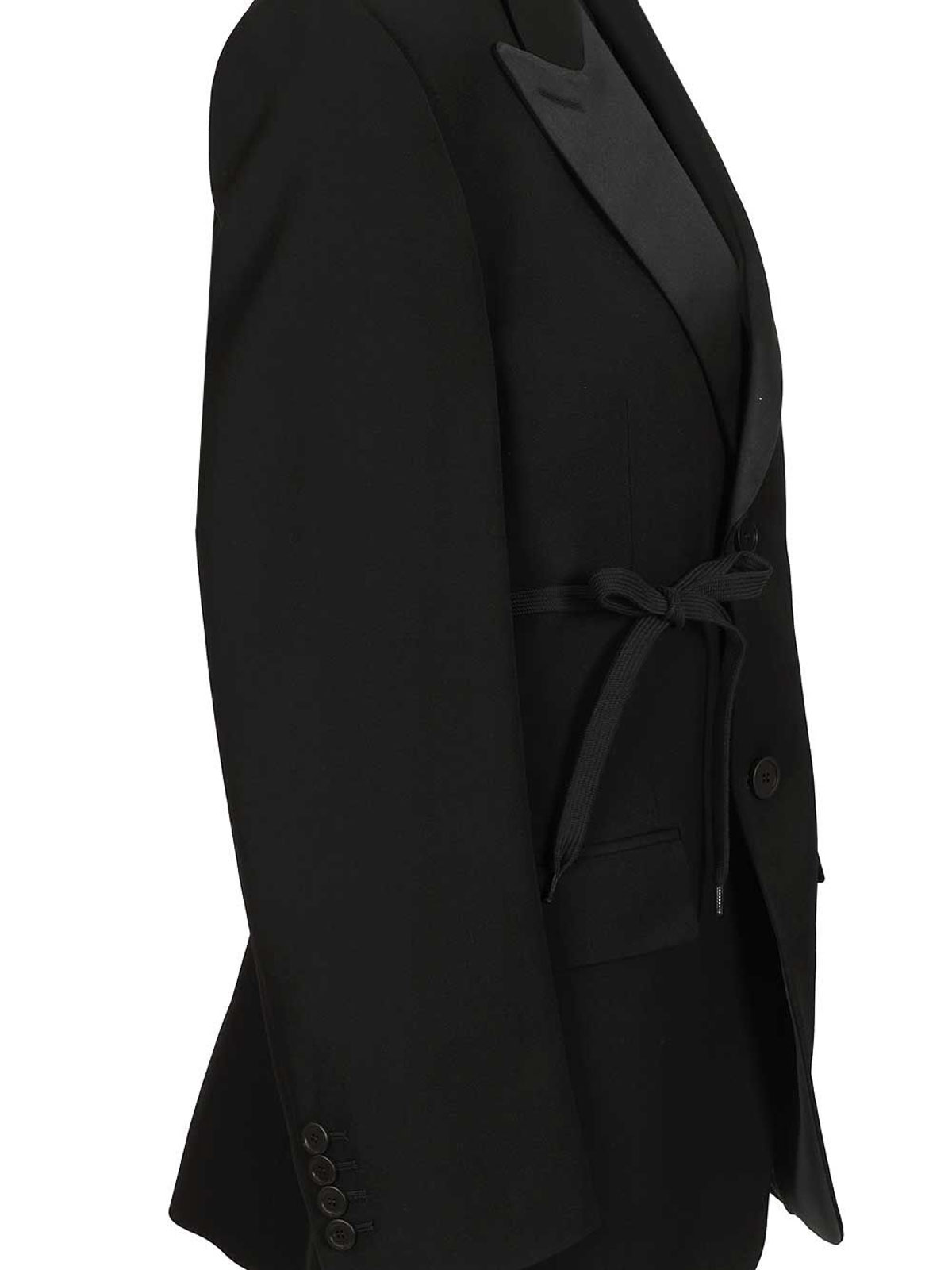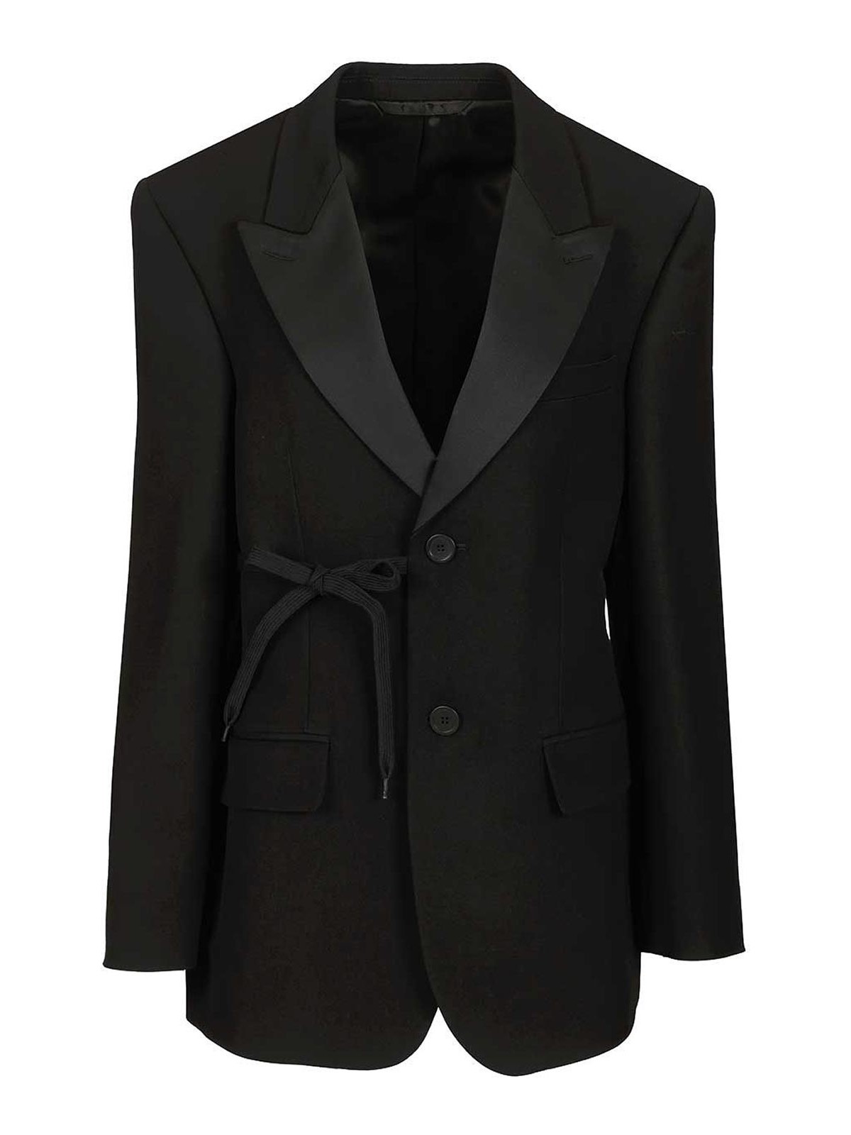 テーラードウールラップタキシードジャケット。ノッチラペル。シングルブレスト、フロントボタン2つ。ラップ構造。ウエストはドローストリングで結ぶ。フロントフラップポケット2つ。4ボタンカフ。バックベント1つ。