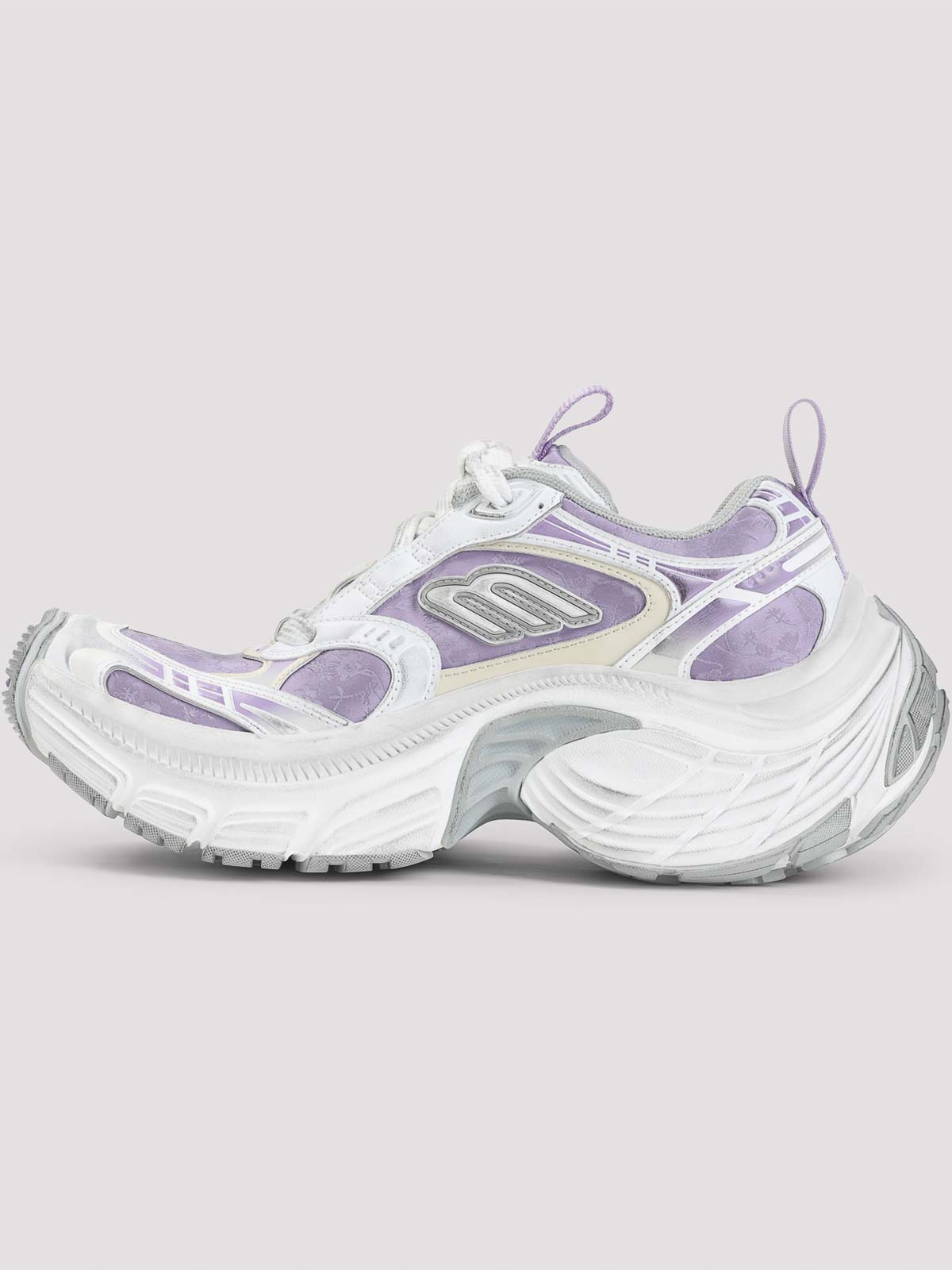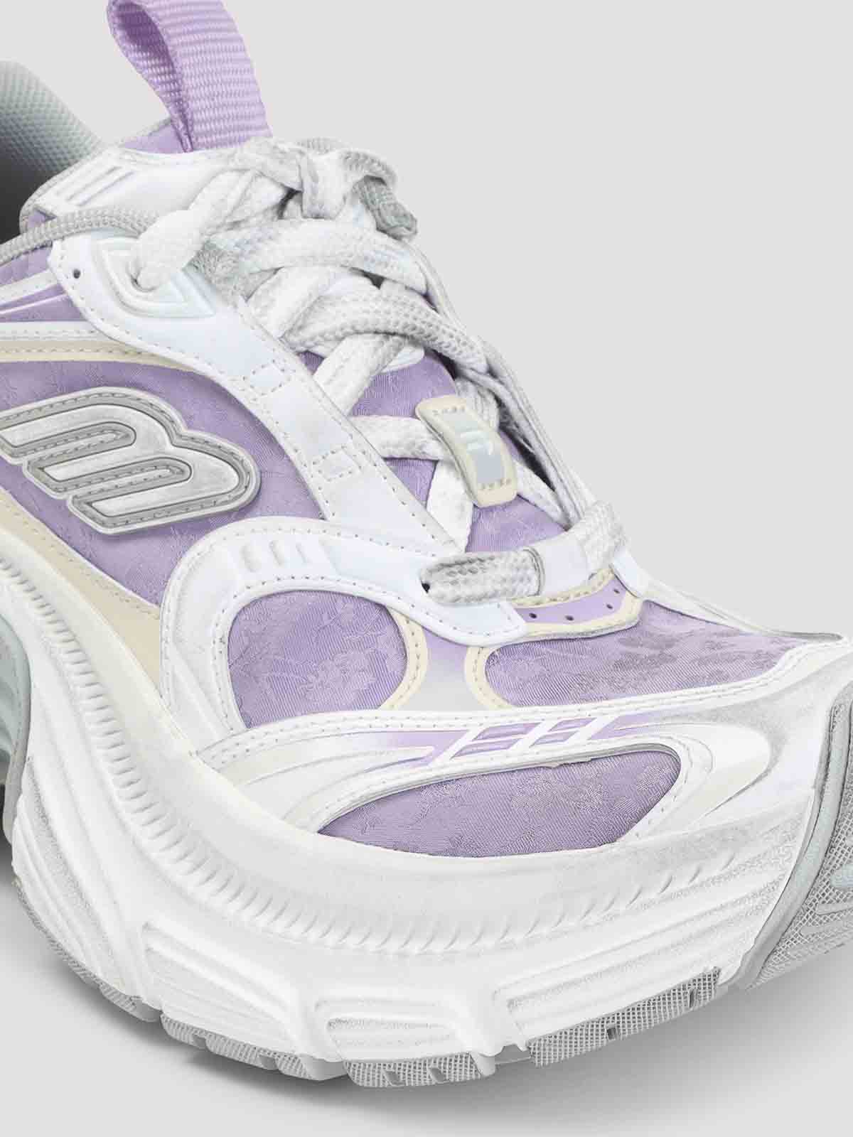 バレンシアガライラック6XLスニーカー。ポリウレタンとポリエステル製。トップレースアップファスナー、タンにライラックストラップ、アッパーにホワイトとライラックのディテール、サイドMロゴ、バックライラックストラップ、ホワイトとベージュのソール。