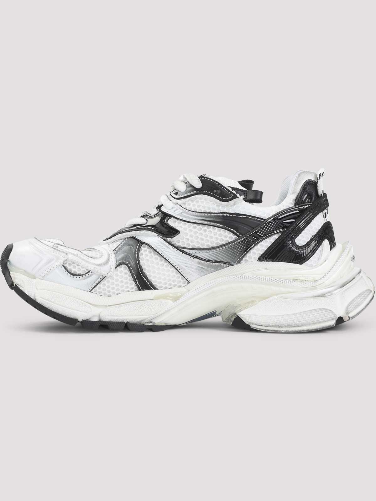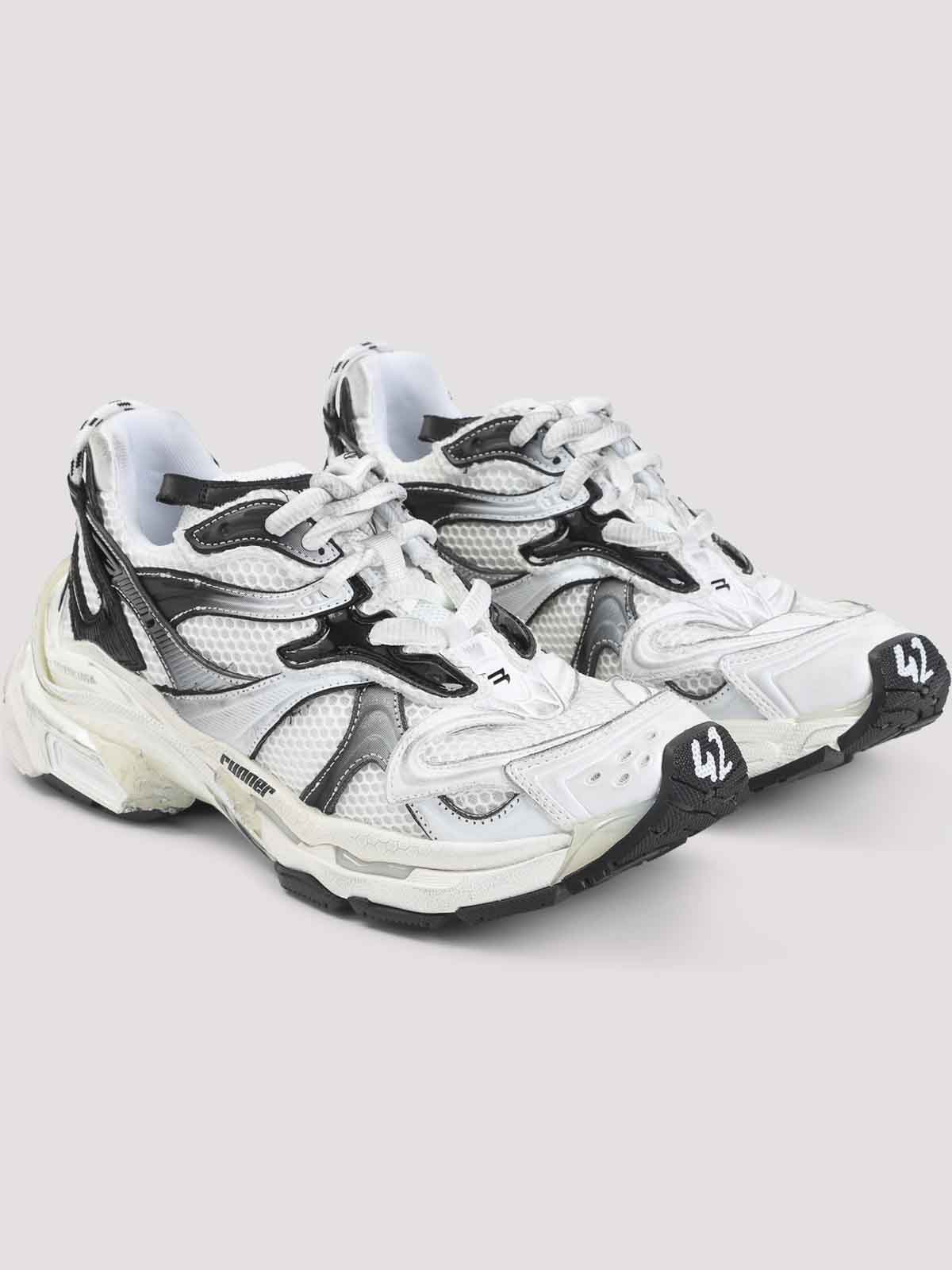 Balenciaga runner 2 白と黒のポリウレタンスニーカー。マルチレイヤーのブラックグラデーションインサートをあしらったホワイトメッシュ製。丸いつま先にサイズの刻印入り、レースアップファスナー、タンにロゴ、サイドにランナーロゴ、ヒールにエンボス加工のサイズとループ、ロゴ入りインソール、ランニングラバーアウトソール。