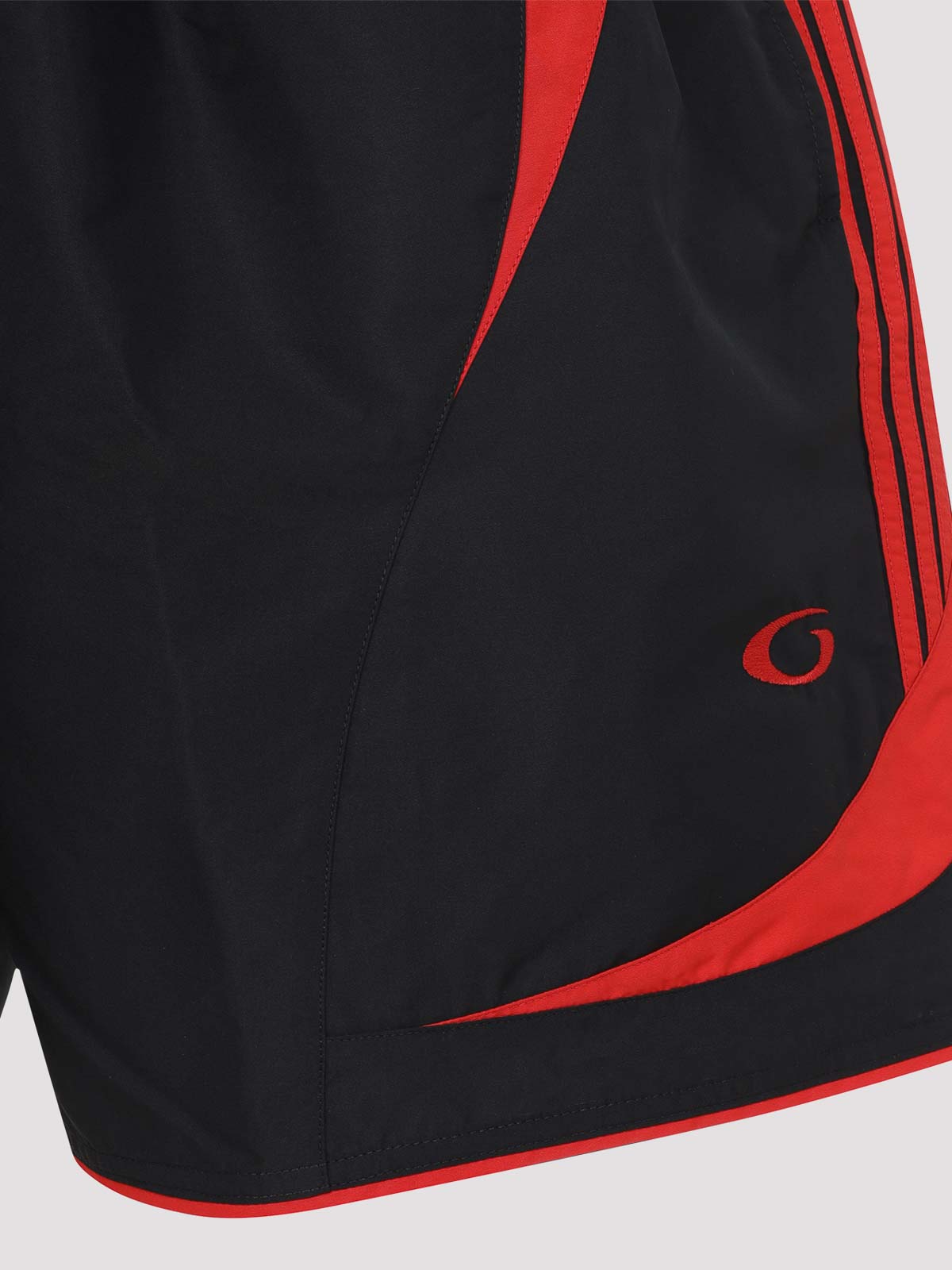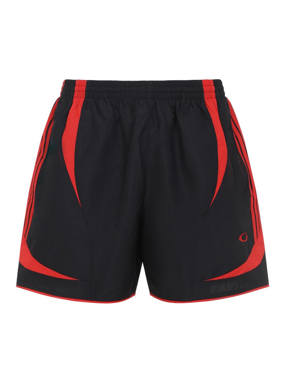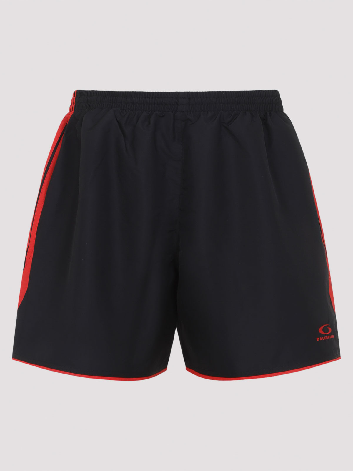 バレンシアガブラックサッカースイムショーツ。純ポリエステル生地。伸縮性のあるウエスト、サイドポケット、サイドコントラストの効いた赤いディテール、サイドロゴ、赤いエッジのストレートヘム。