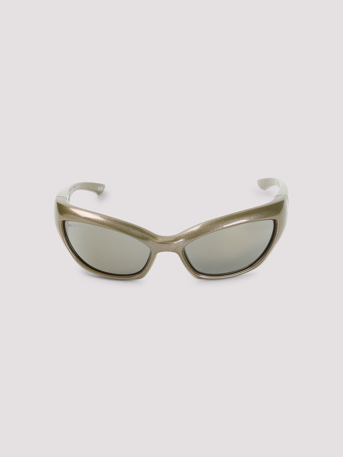 バレンシアガマッドグリーンアセテートレーサーキャットサングラス。ピュアマッドグリーンアセテートサングラス。マスクデザイン、トーンフレーム、サイドにホワイトレタリングロゴ付きトーンレンズ、トーンテンプル。