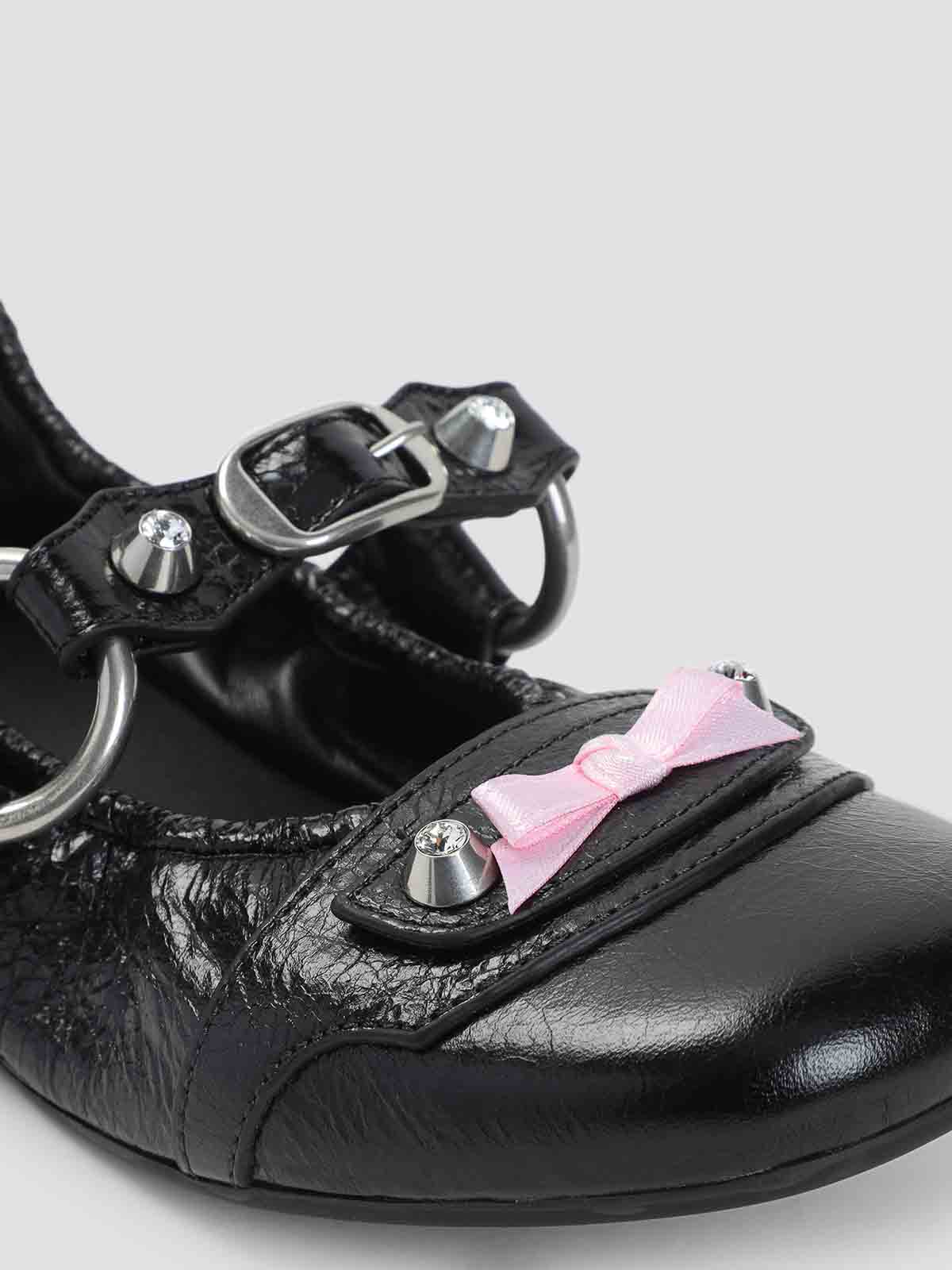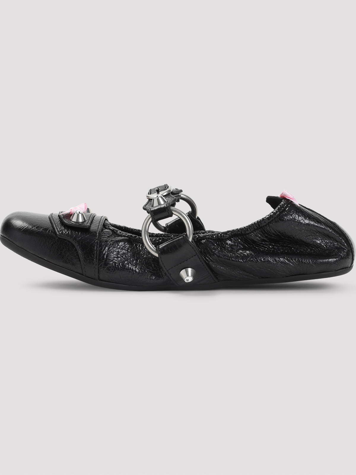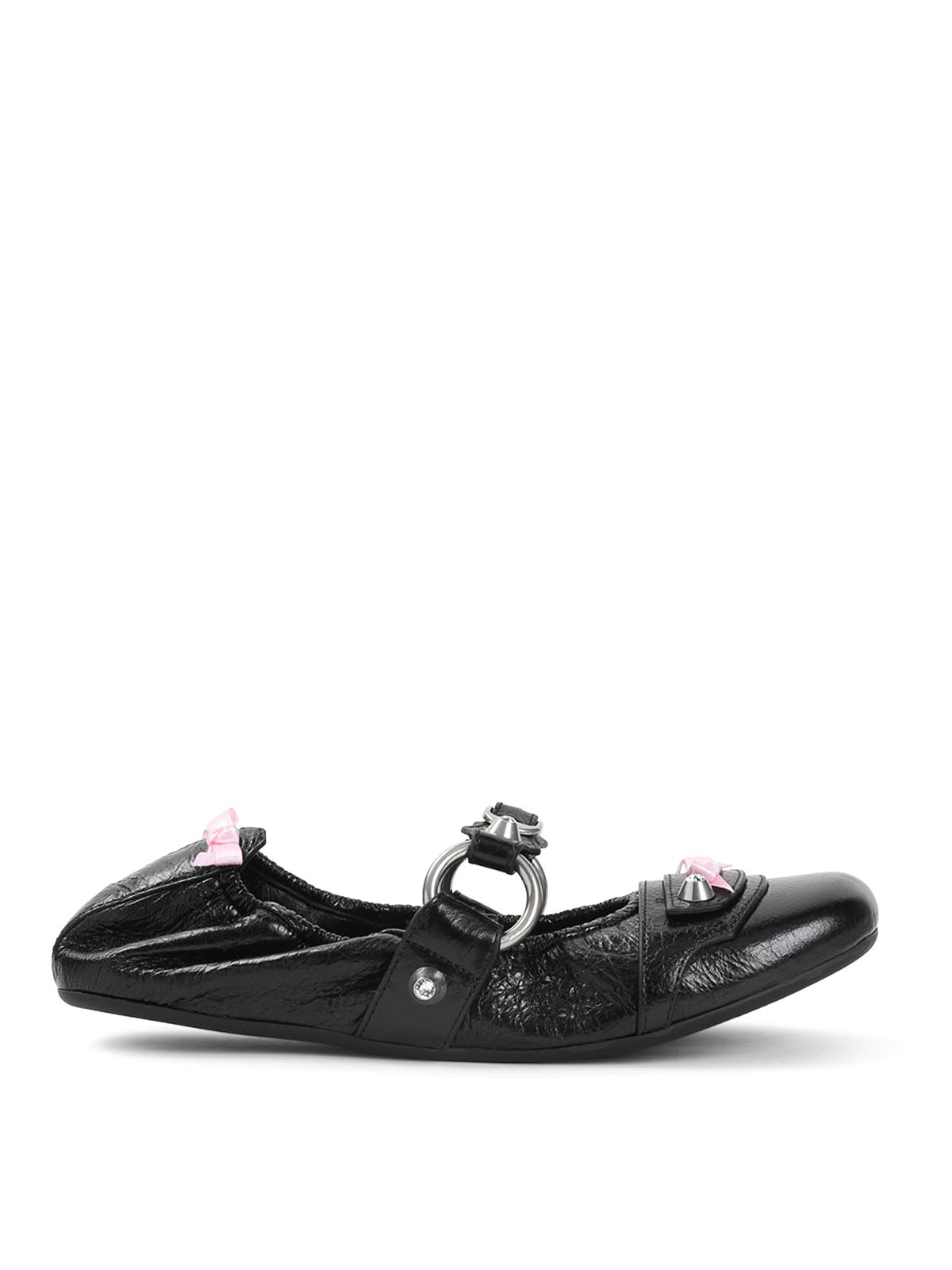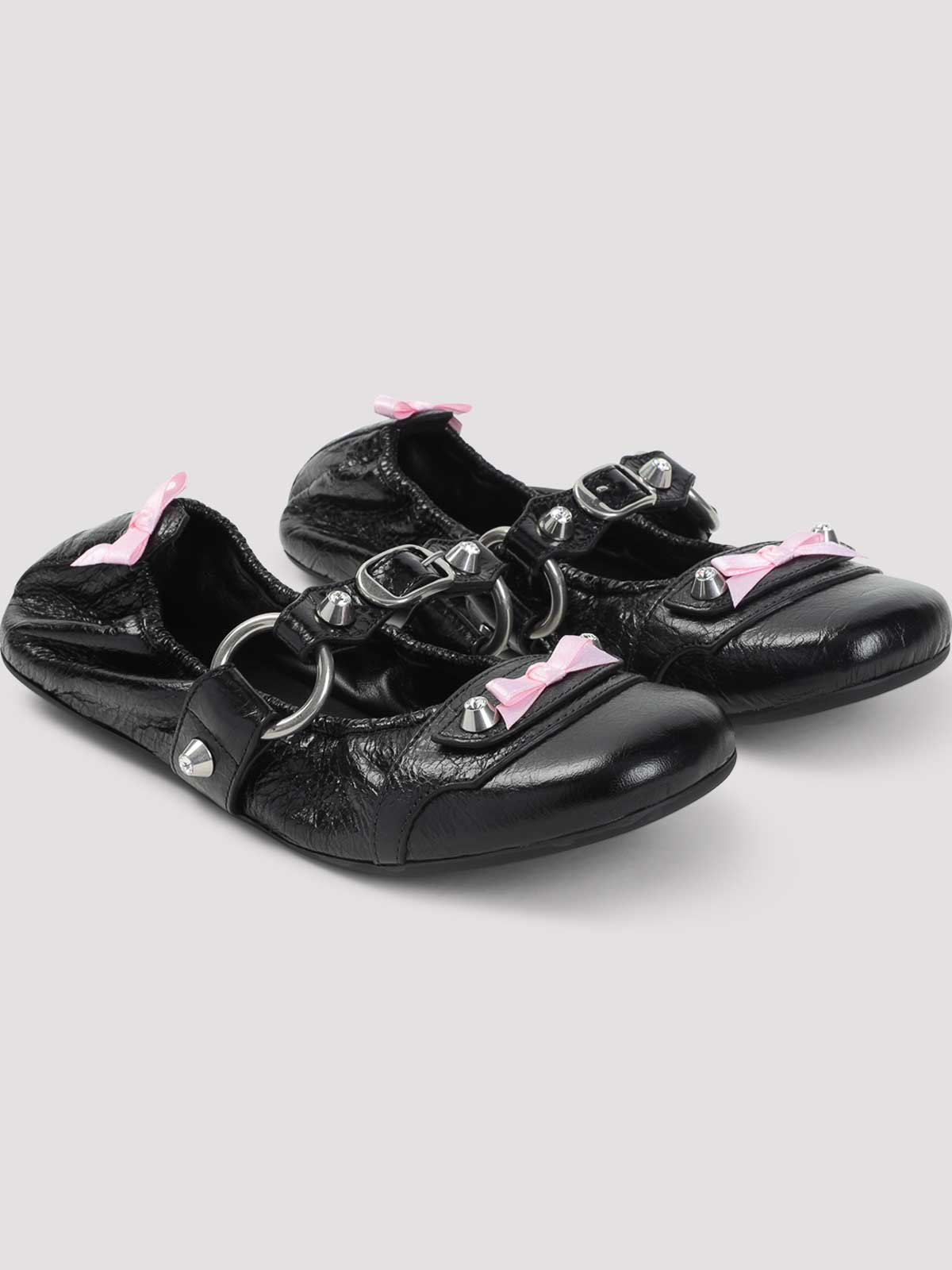 Balenciaga ブラックラムレザーシティフラット L005 サンダル。ブラックラムレザーサンダル、ラウンドトゥ、トップシルバートーンスタッズディテールにクリスタルのディテール、トップとバックにローズプードルボウディテール、スタッズディテールをあしらったトップトーナルレザーストラップ、フラットデザイン、トーナルソール。