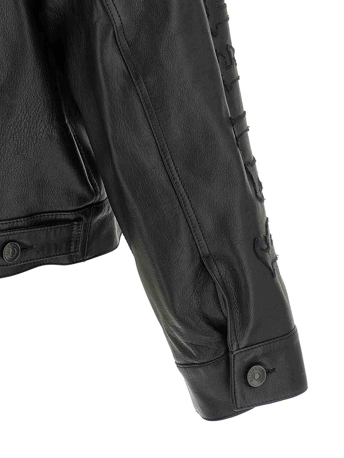 ガーネットバッファローレザーのシャツスタイルのジャケット。右袖にトーンオントーンの「ゴシックデニム」パターンが刺繍されています。前面には金属製のボタン留め、ポケット、袖口とドロップショルダーが付いたラグランロングスリーブ、キュプラの裏地が付いています。