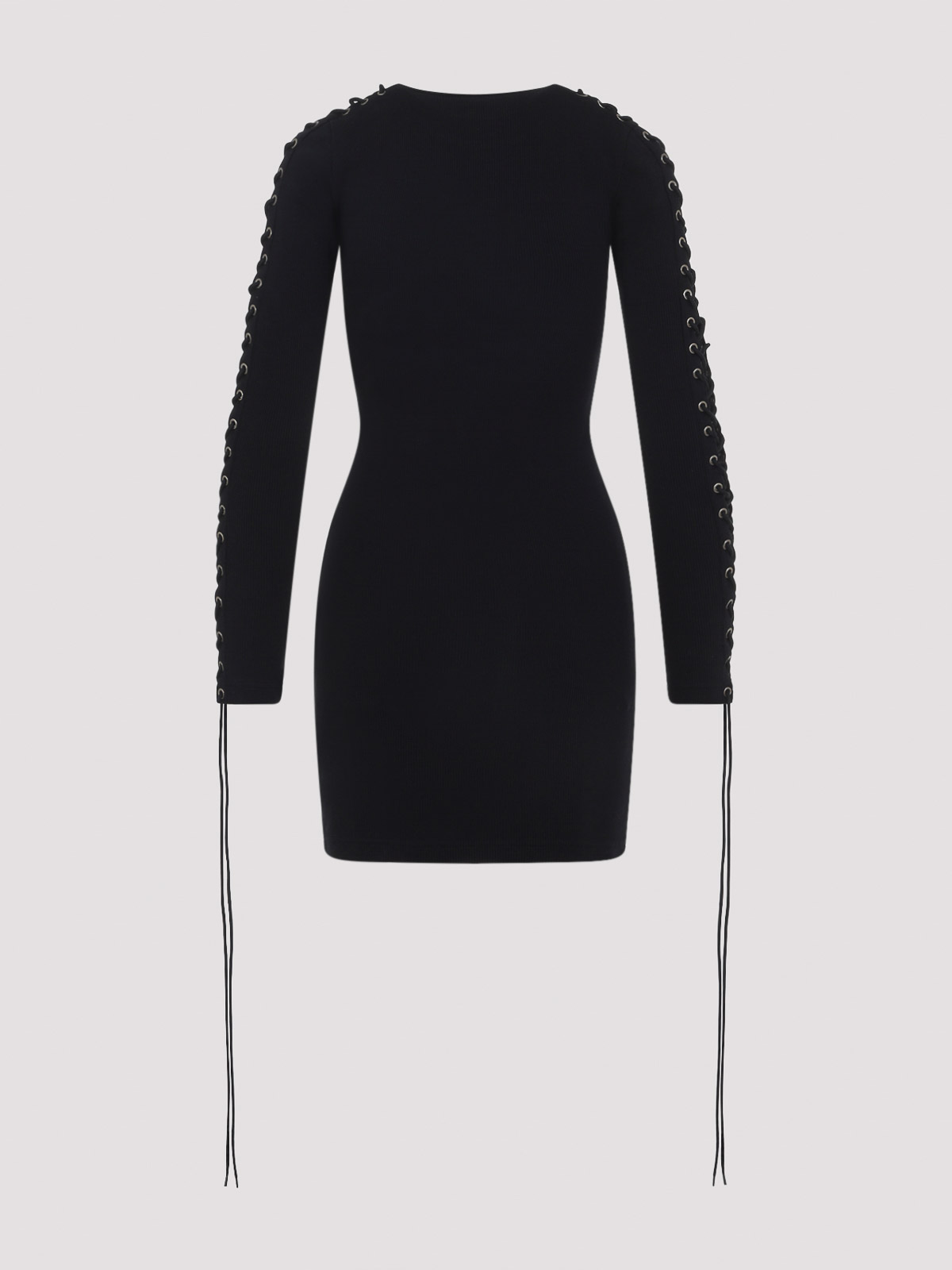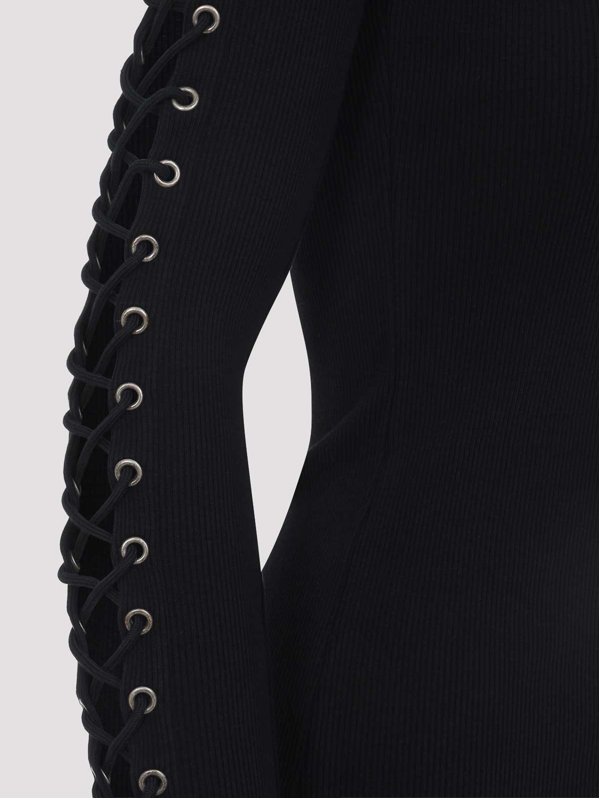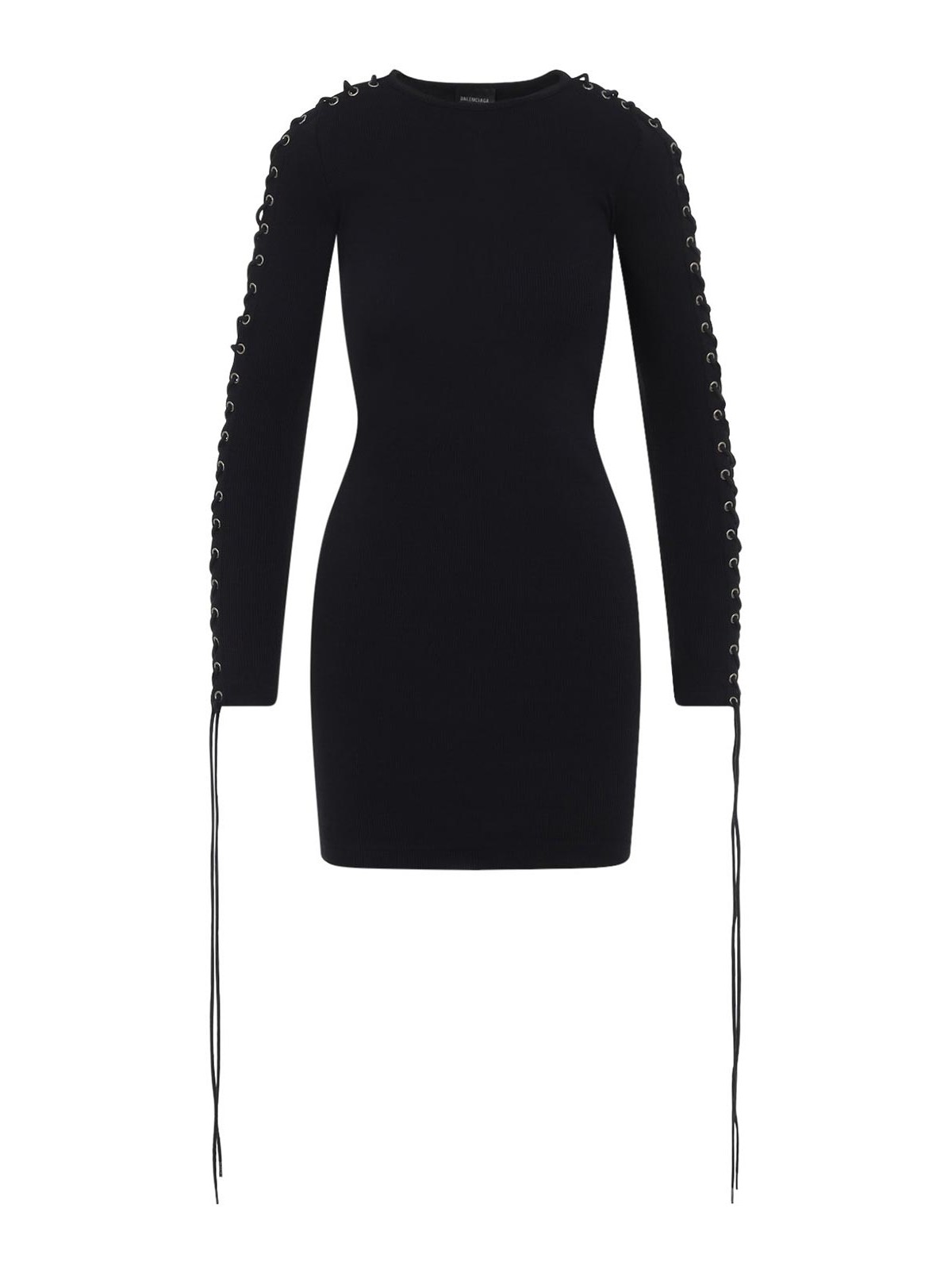 バレンシアガのレースアップブラックコットンミニドレス。リブ編みのコットンジャージー製で、ラウンドネック、アイレット、袖に沿ったエクストラロングレース、スリムフィット、ストレートヘムが特徴です。