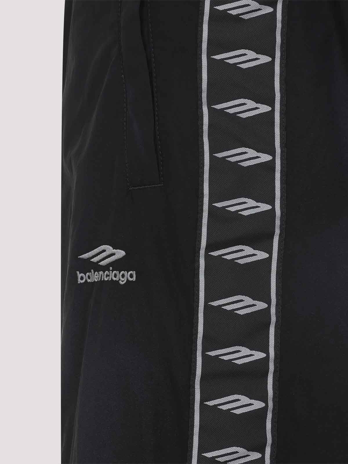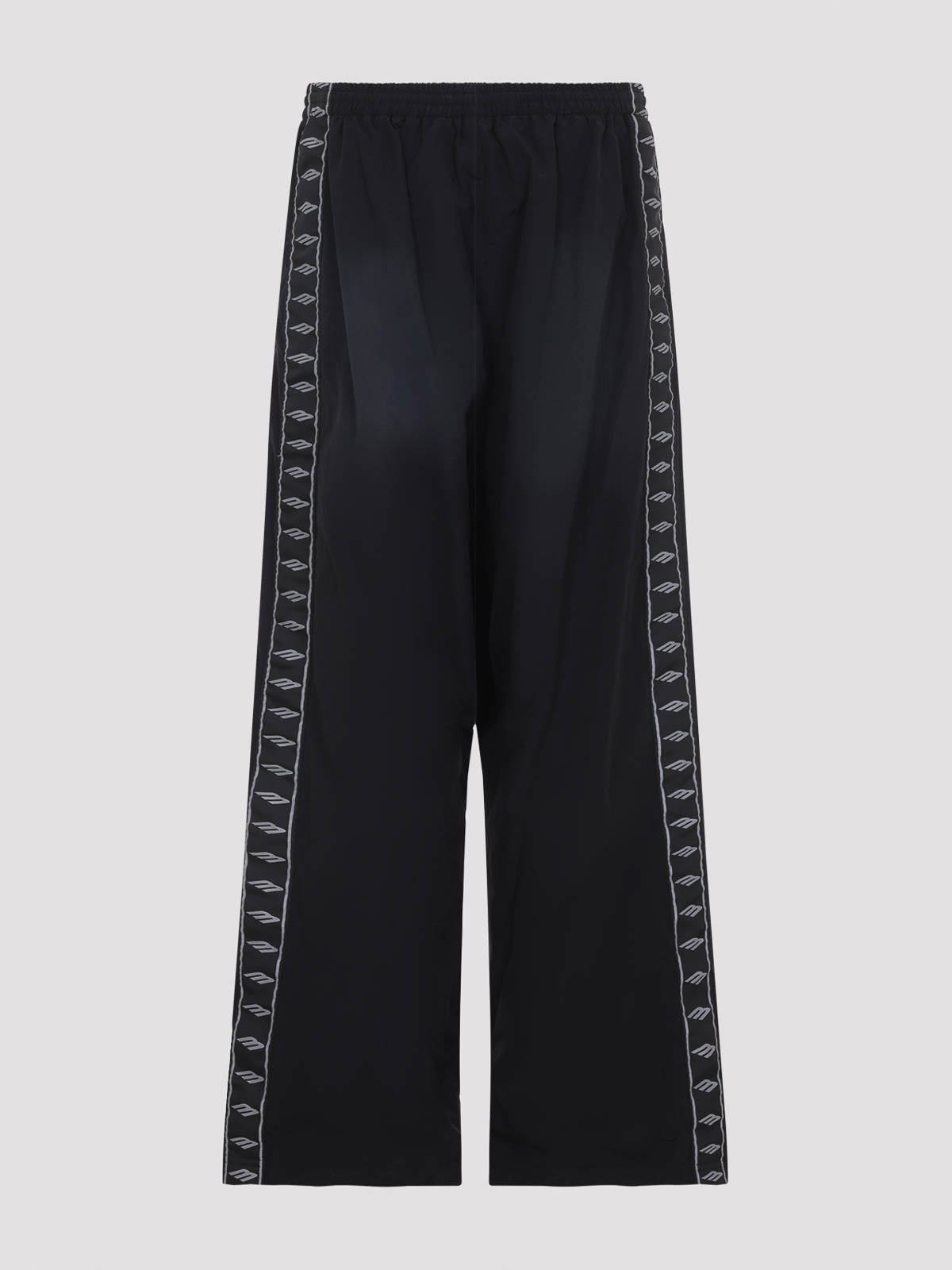 Balenciaga トラックスーツブラックコットンパンツ。ブラックコットン混紡素材で、低いクロッチ、隠しドローストリング付きの伸縮性ウエストバンド、サイドポケット、サイドにロゴ刺繍、脚にブランドバンド、ワイドレッグ、リラックスフィットが特徴です。