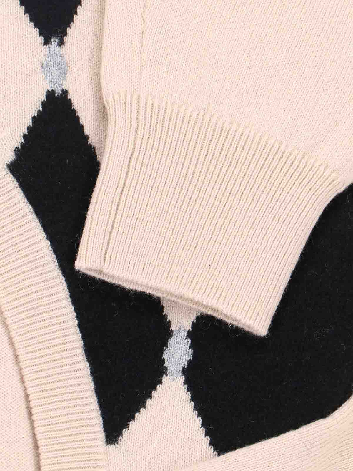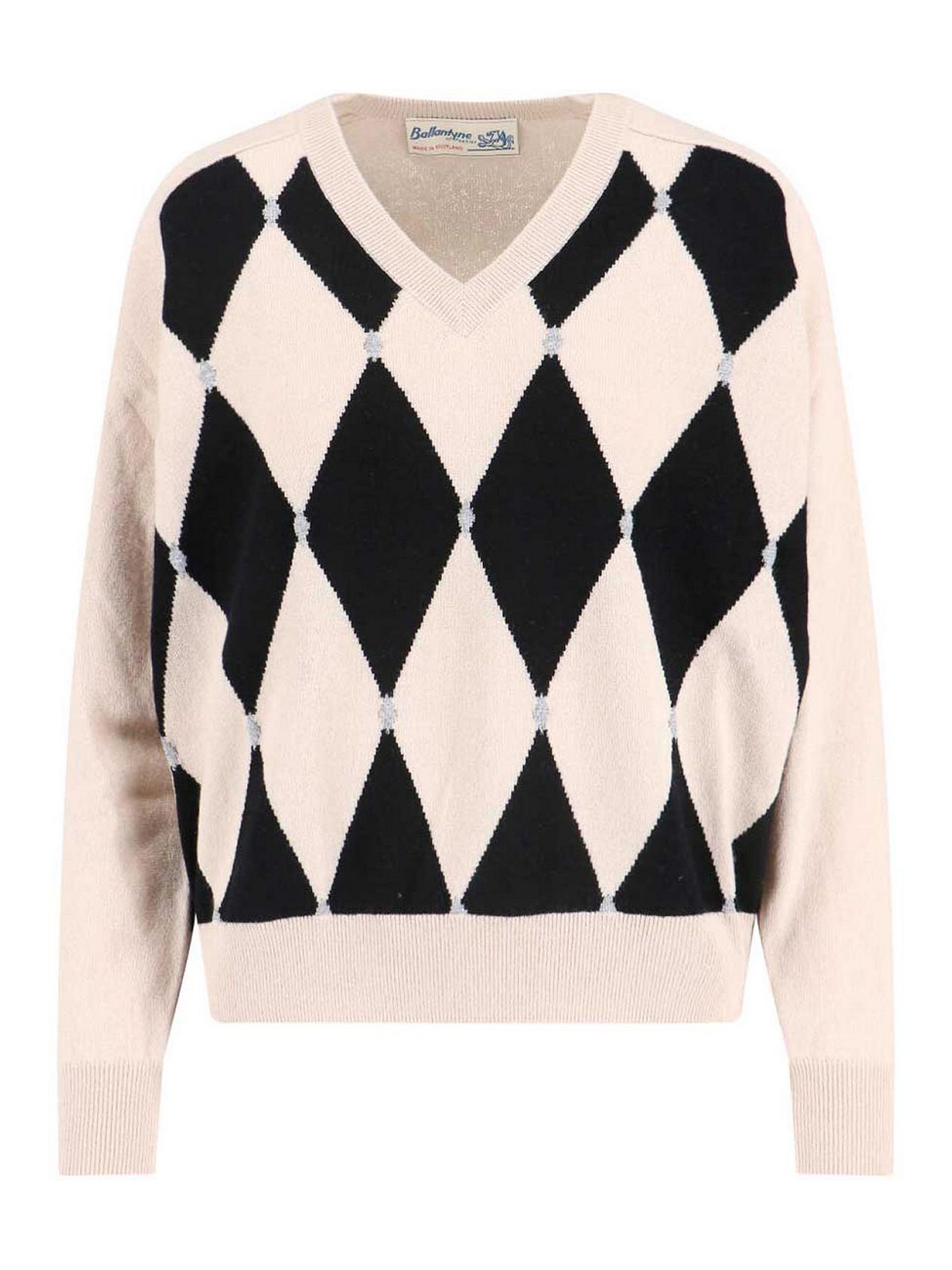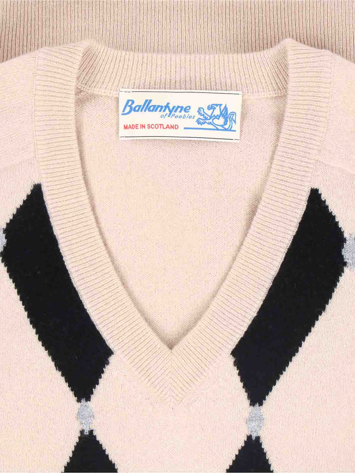 バランタインカシミアセーター、ベージュ、Vネック、ロングスリーブ、フロントコントラストカラーの象眼模様、リブ仕上げ、ストレートヘム。
