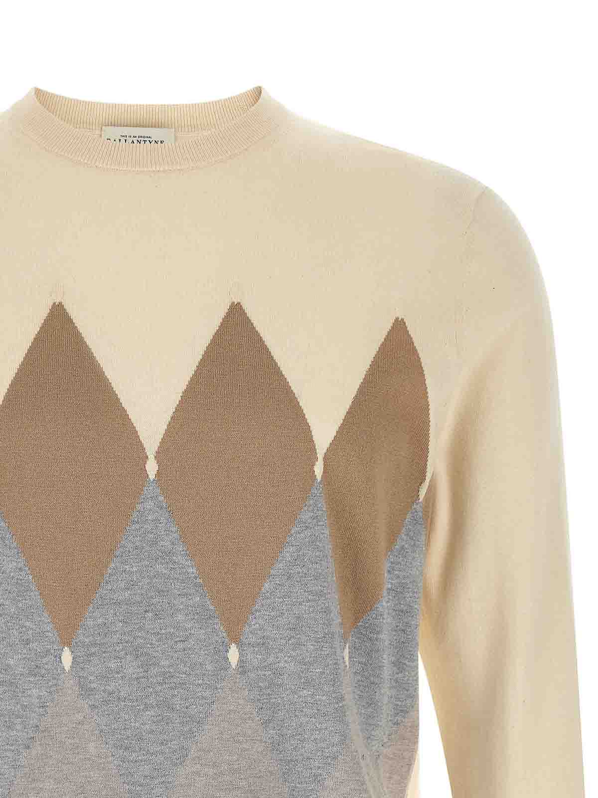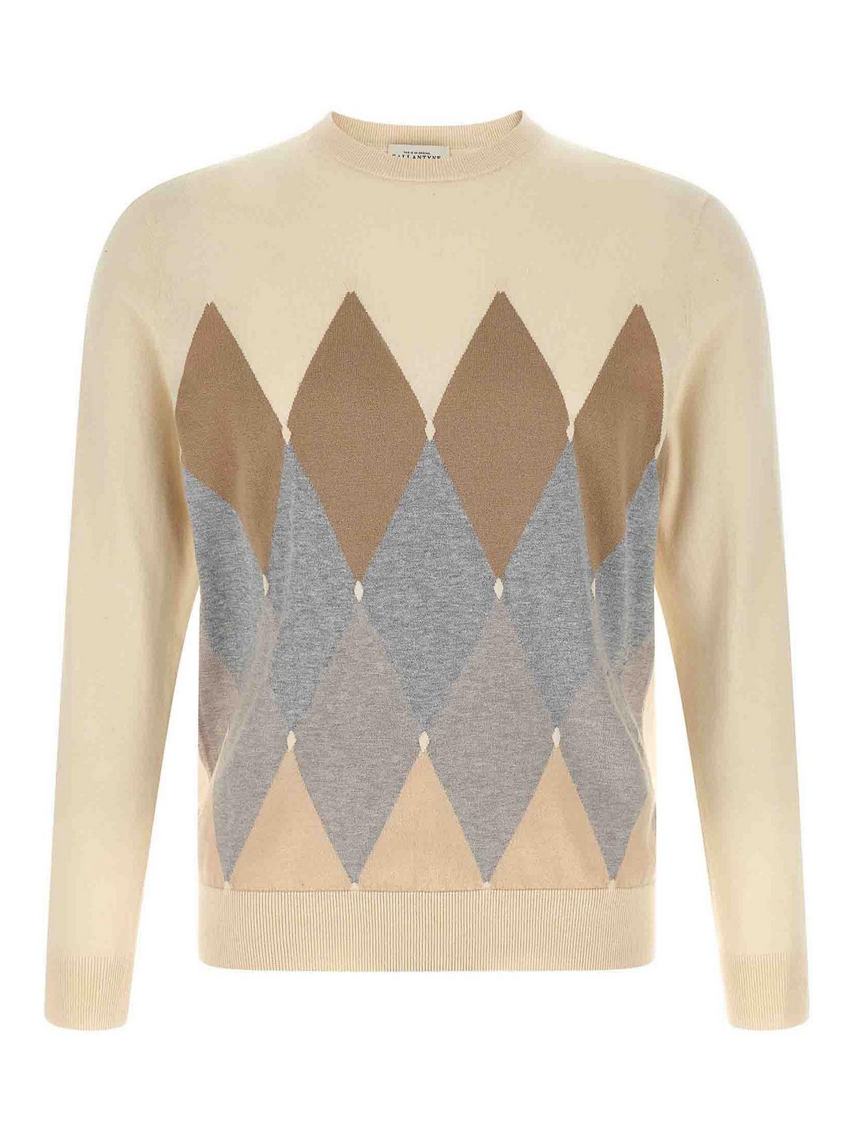コットンとカシミアの混紡セーター。前面にアーガイルジャカード柄、クルーネック、ロングカフスリーブ、裾にヘッドバンドが付いています。
