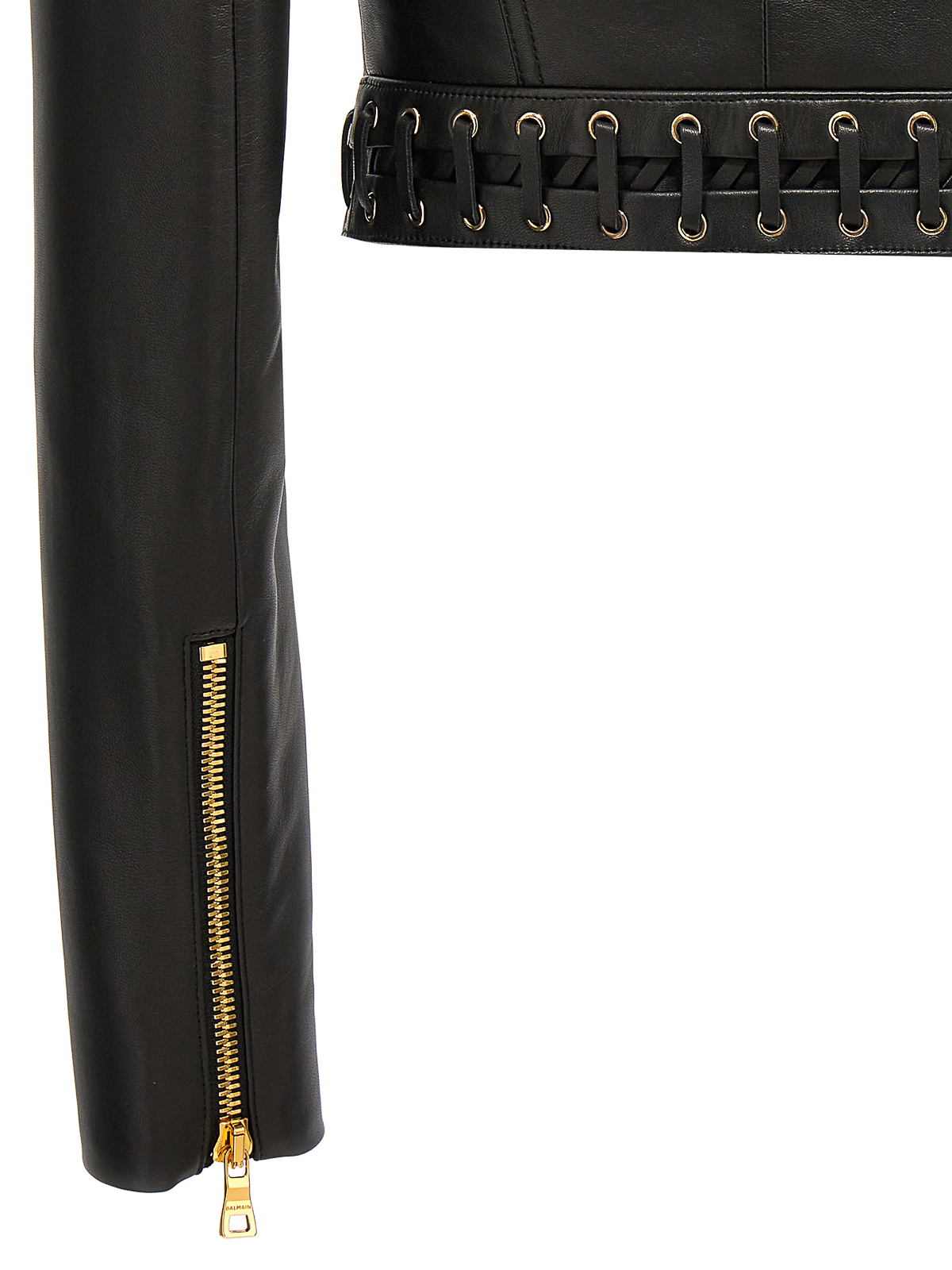 レースアップディテールをあしらったクロップレザーのブレザージャケット、コンシールクロージャー付きクルーネック、胸ポケット付き。