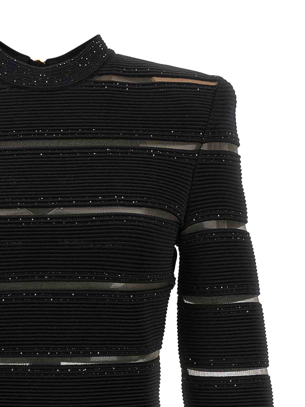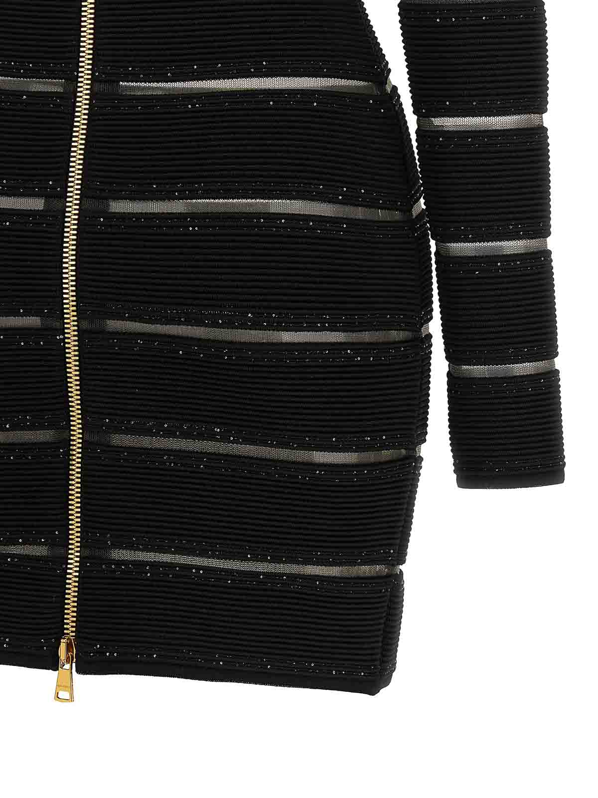 透明なメッシュのインサートとマイクロスパンコールのアップリケをあしらったストレッチビスコースのボディコンミニドレス。クルーネック、パッド入りショルダー、ロングスリーブ、背面にフルハイトのジッパーが付いています。