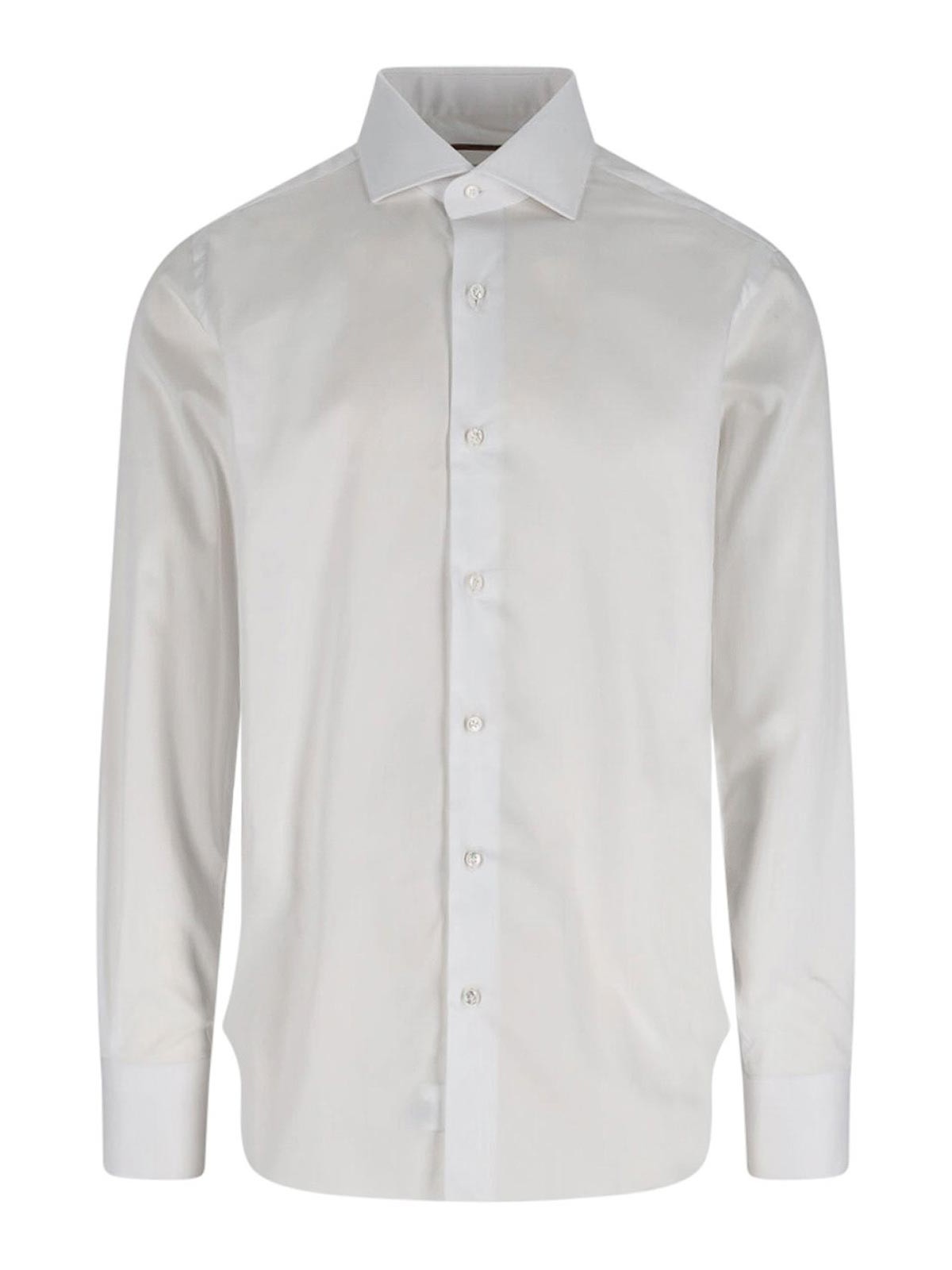 クラシックなナポリビアードシャツ、ホワイトコットン、クラシックカラー、ボタン留め、ボタン付きカフス、サイドヘムにロゴ刺繍、カーブヘム。