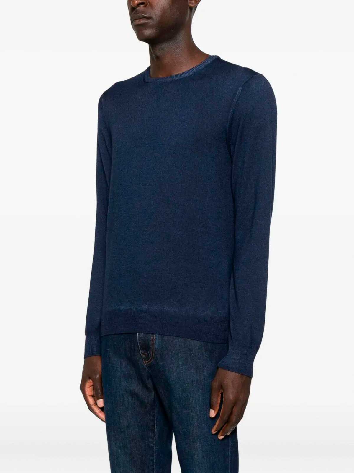 ネイビーブルーのファインニットクルーネック、リブ編みのトリム、ロングスリーブ、ストレートヘム