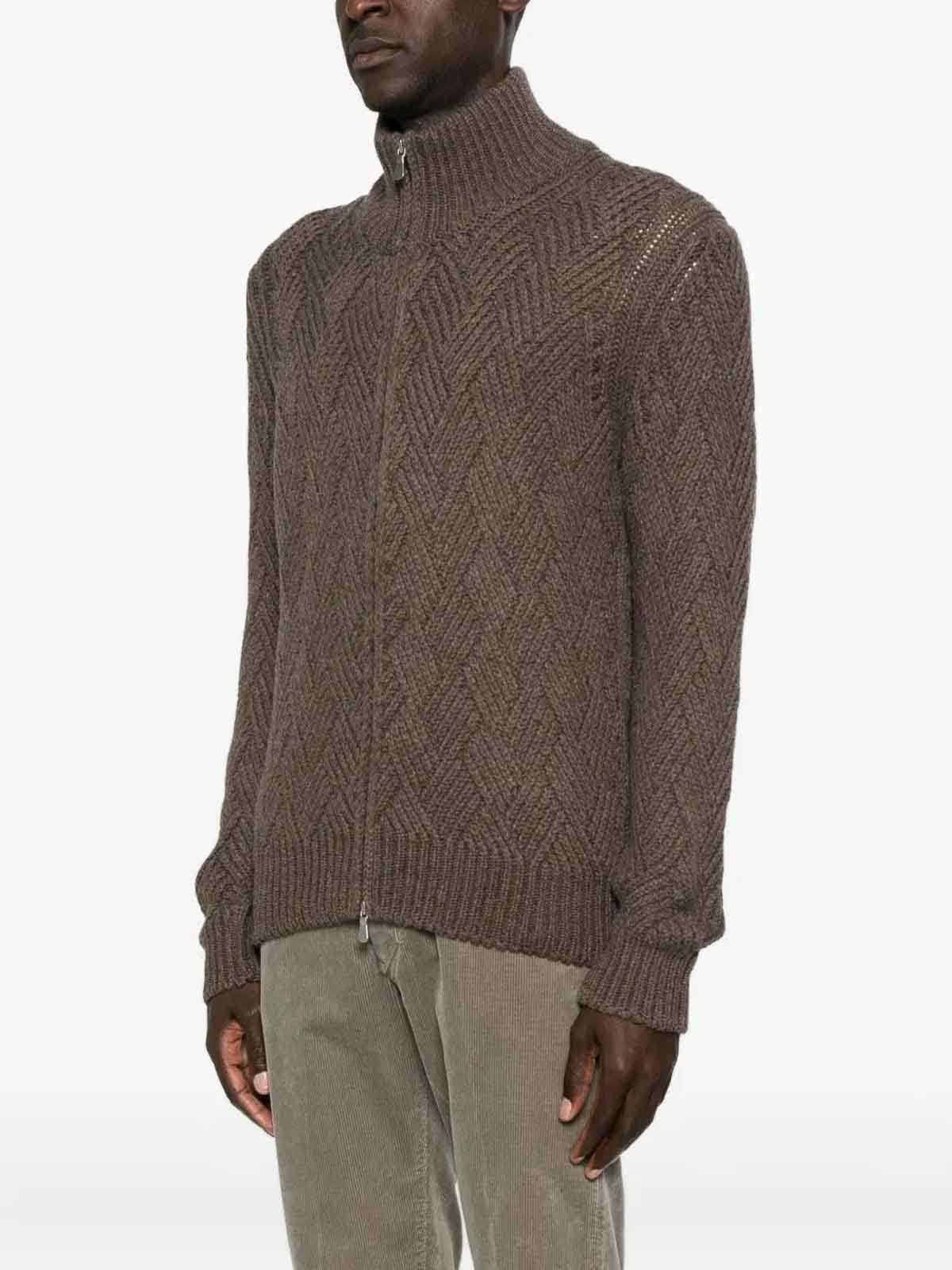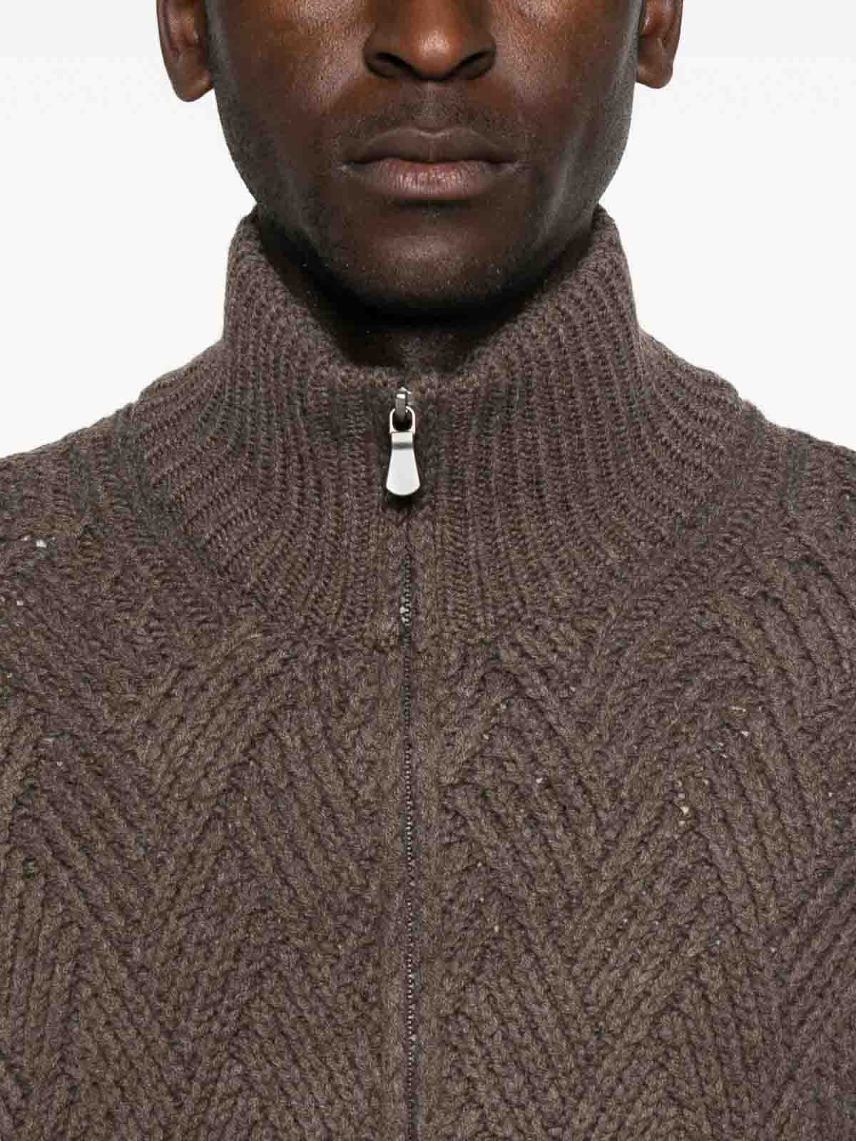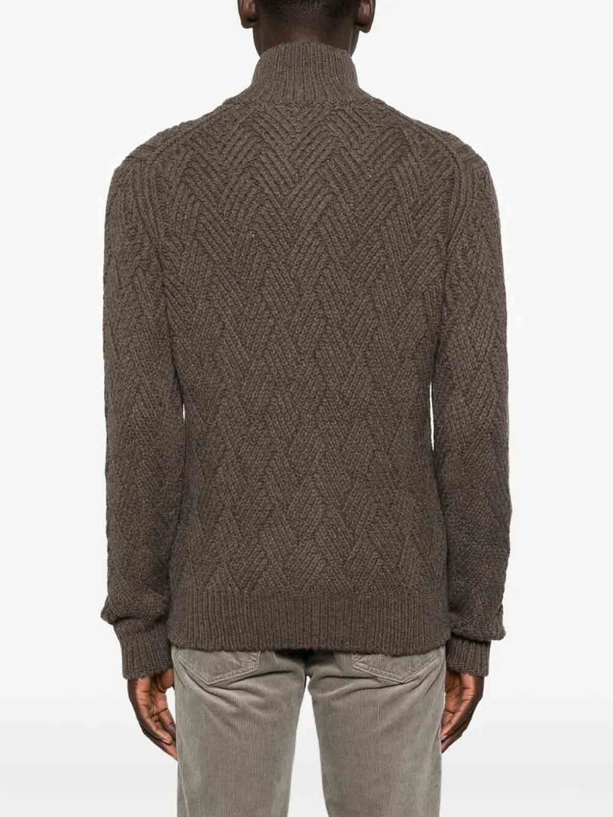 ダークブラウン、質感のあるニット、フロントファスナー、ハイカラー、リブ編みの裾と袖口