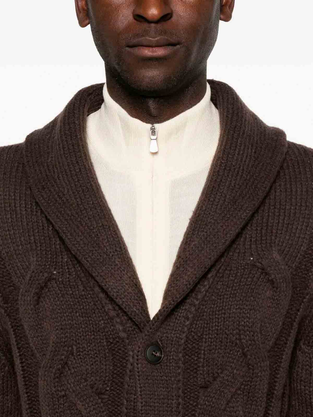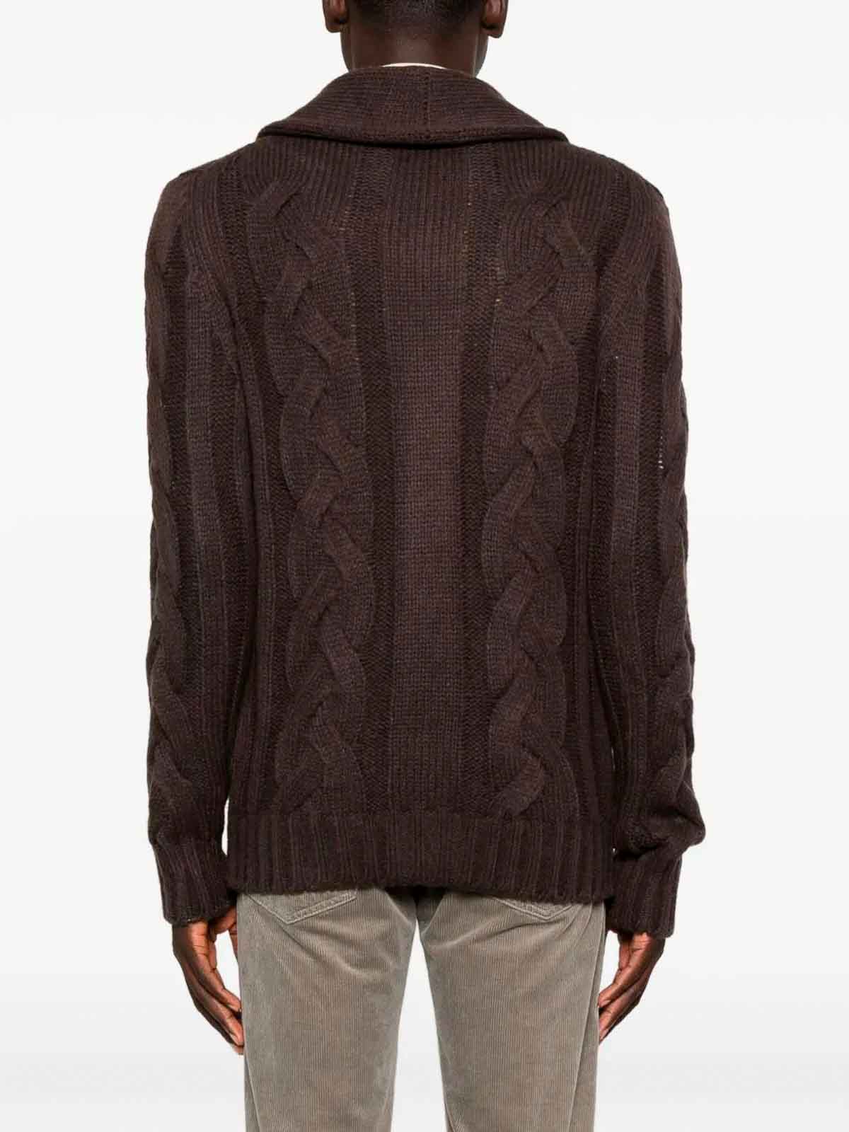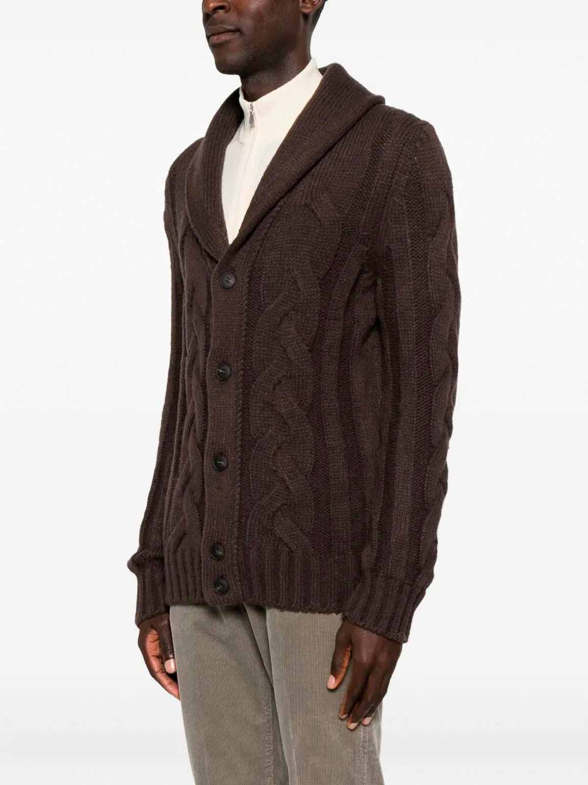ブラウンケーブルニットフロントクロージャー、ボタン付き、ショールカラー、ロングスリーブ、リブ付きヘム
