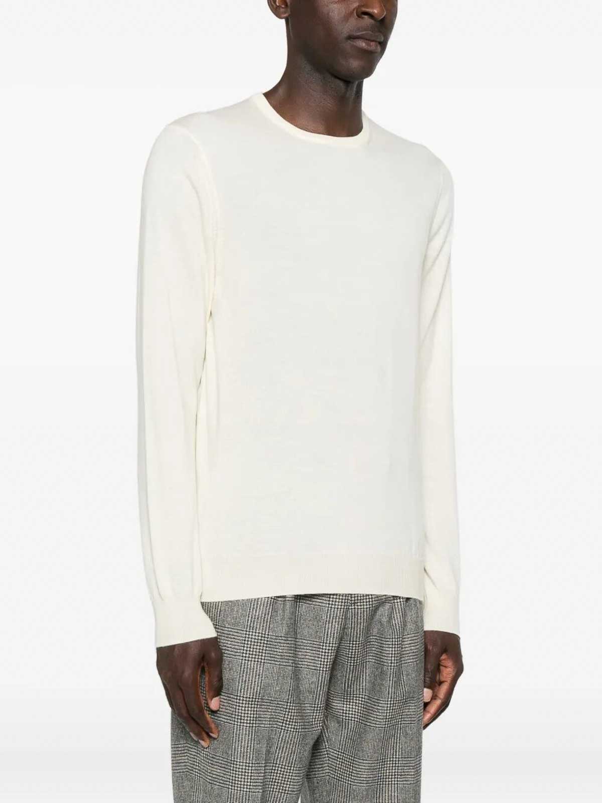 リブ編みの袖口とリブ編みの裾が特徴の長袖の白いクルーネック