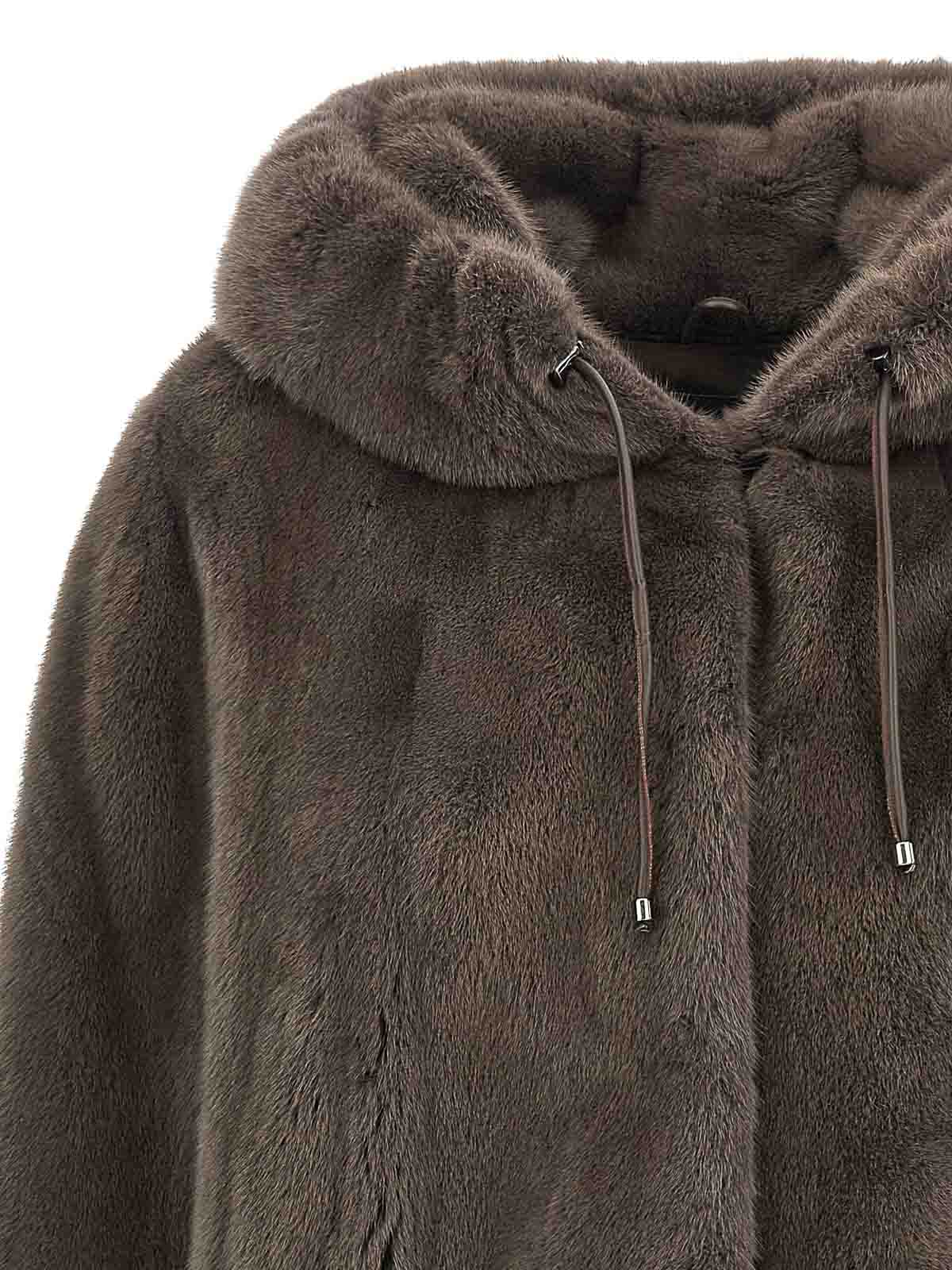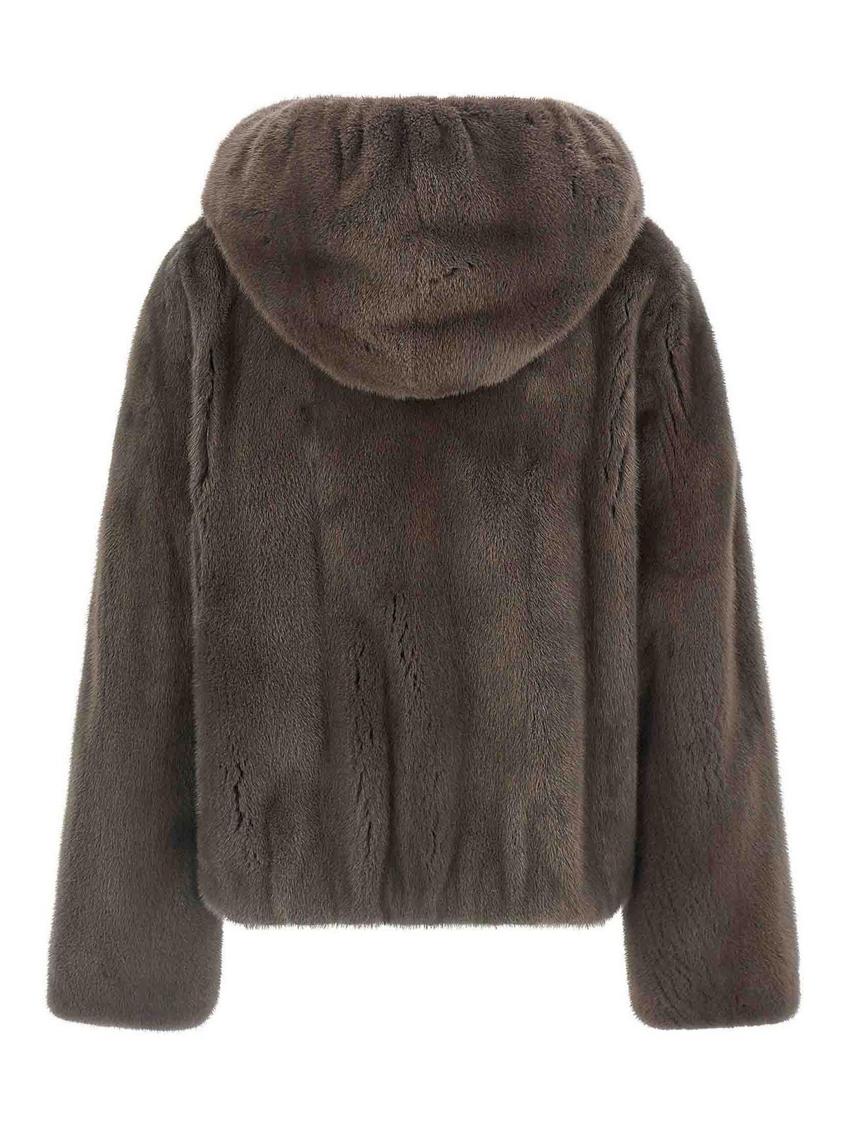滑らかなレザーのディテールが施されたミンクファーの「バリー」ジャケット、調節可能なフード、フロントフッククロージャー、ポケット、長袖、裾のドローストリング、裏地付き。
