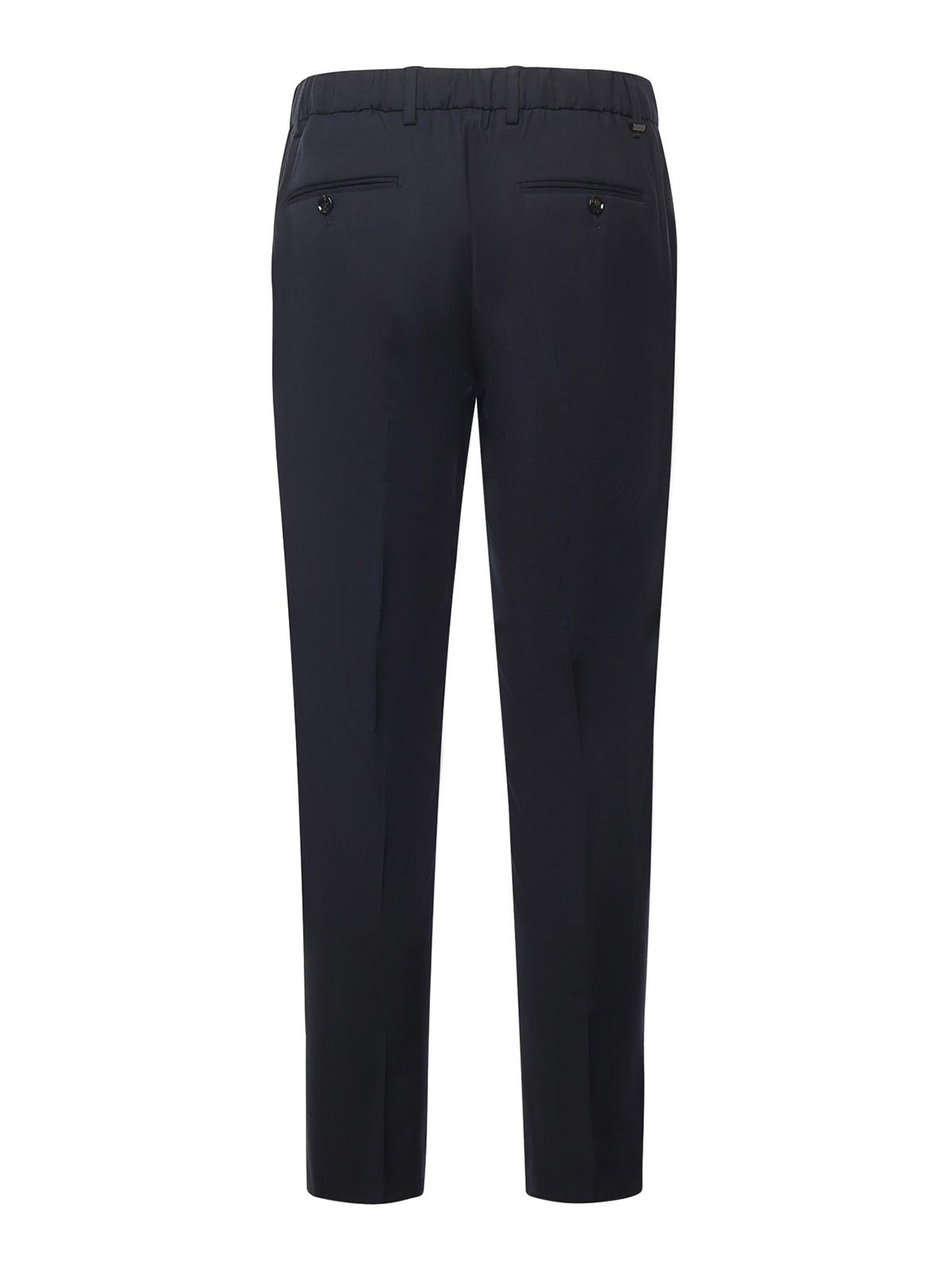 ウエストにベルト、後ろにウェルトポケット、ボタン、ジッパー