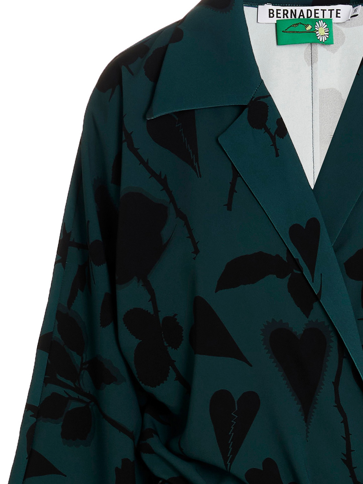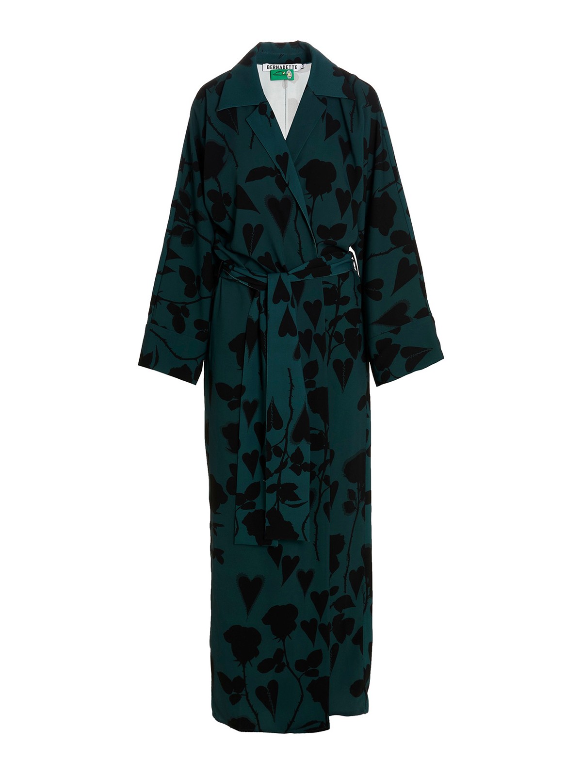 オールオーバープリントのロングローブドレス、ラップアラウンドボウタイ留め、ロングスリーブ。