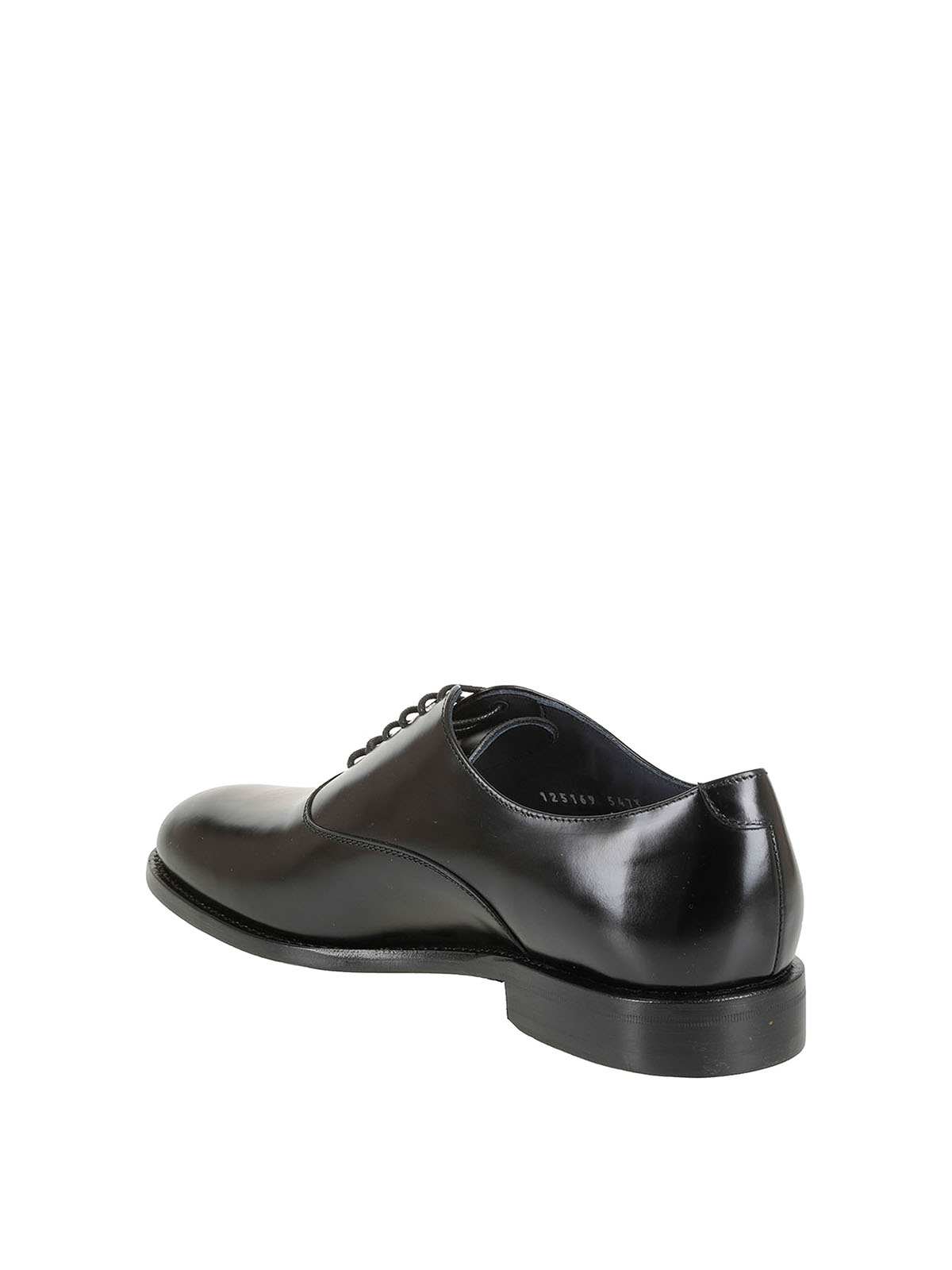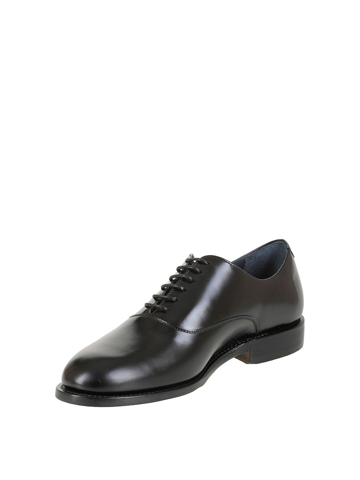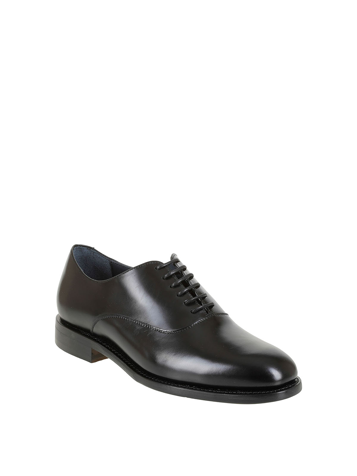 ブラックレザーのオックスフォード、レース付きクロージャー、レザーソール。