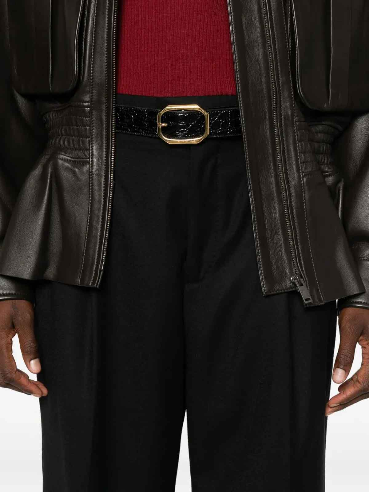 フロントはプリーツパンツ、裾はカフ付き、ストレートレッグ