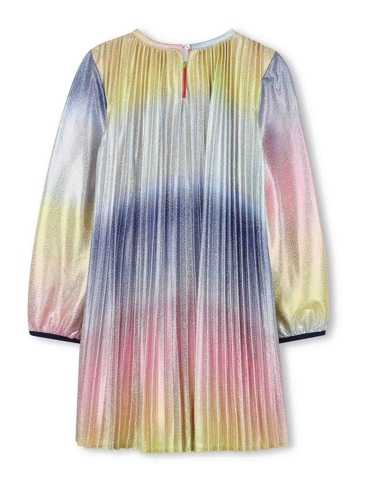メタリック調のプリーツドレス。パステルピンクの長袖、ラウンドネック、後ろに鍵穴が開き、プリーツデザインが施されています。