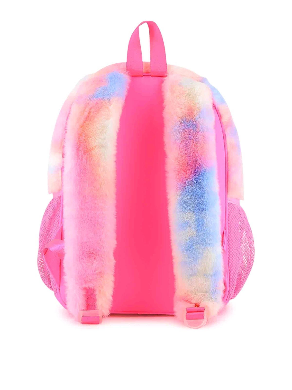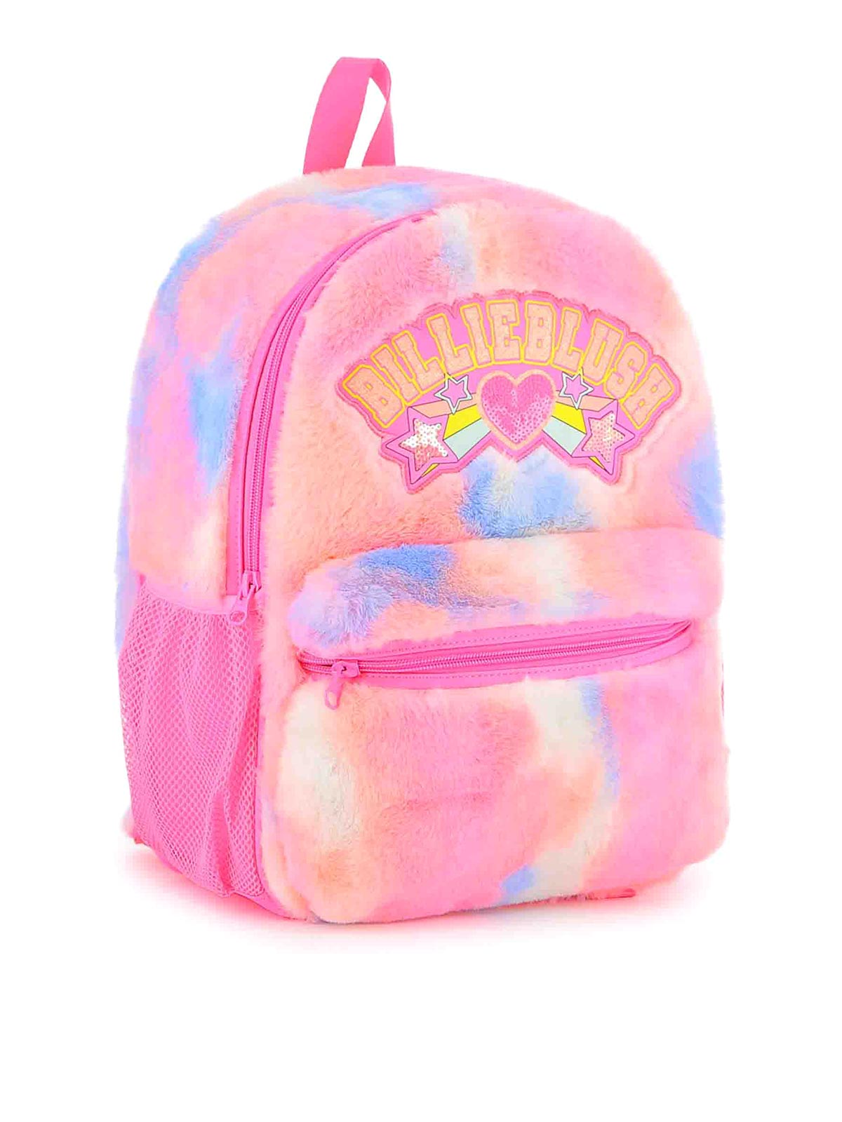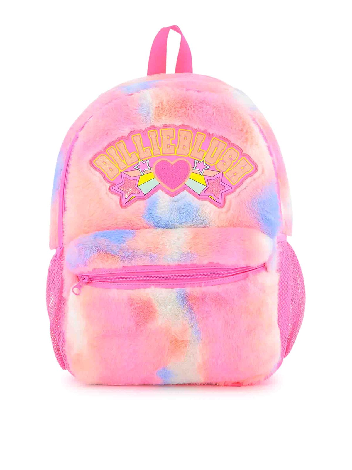 パステルピンクのロゴとハートのグラフィックが特徴のタイダイ柄のバックパック。サイドメッシュポケットには調節可能なショルダーストラップが付いています。