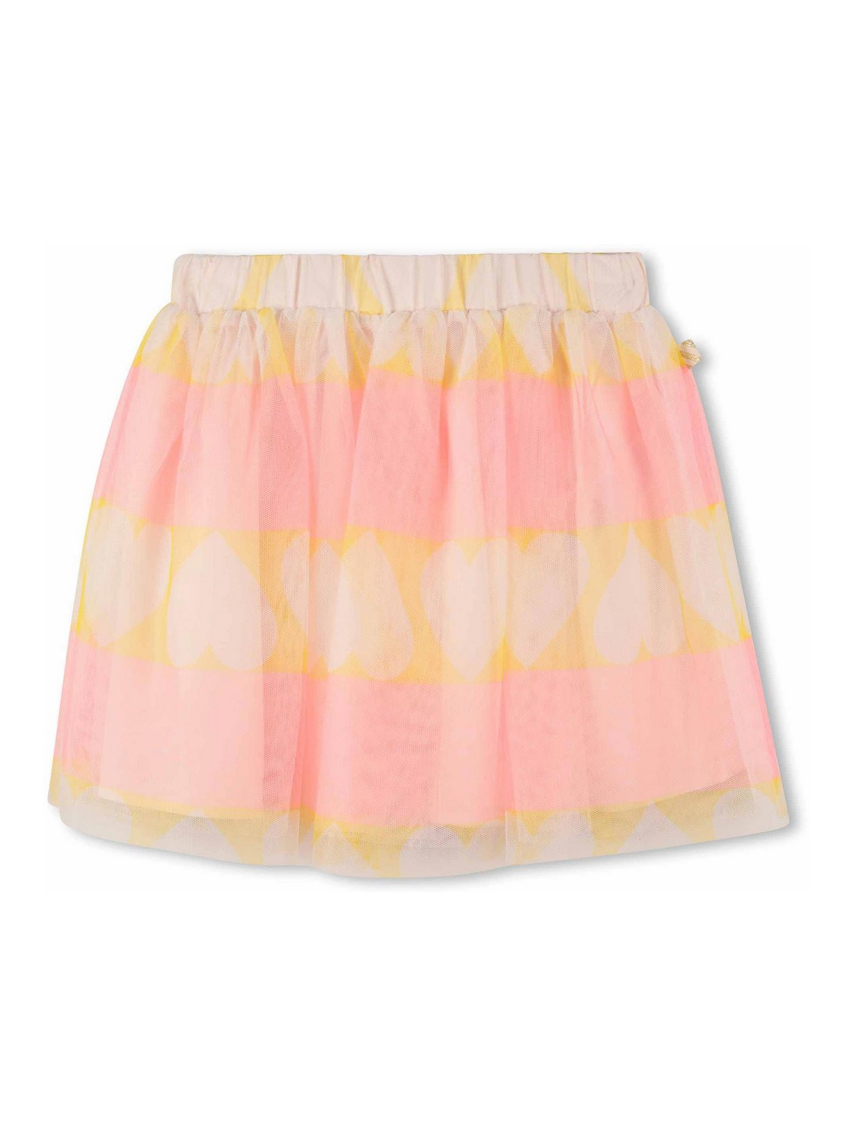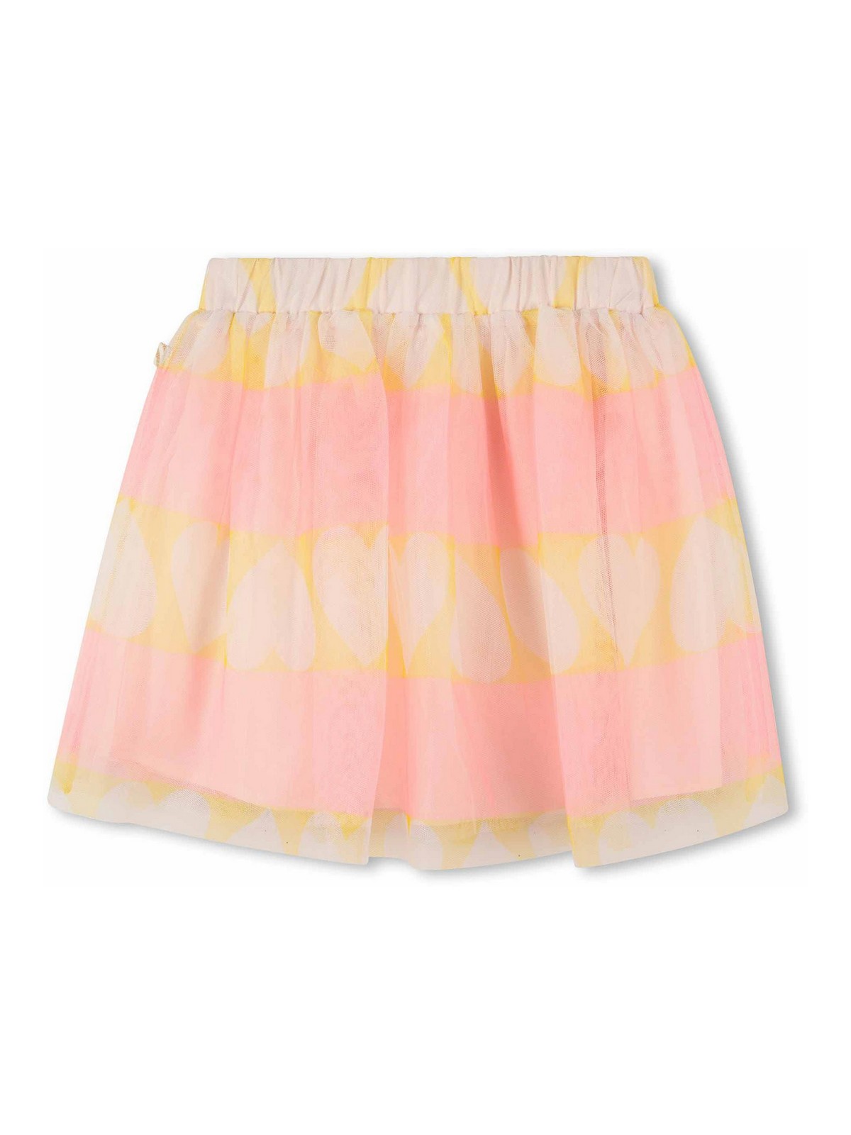 プリントスカートはピンクのハート柄の伸縮性のあるウエストのレイヤードデザインが特徴です