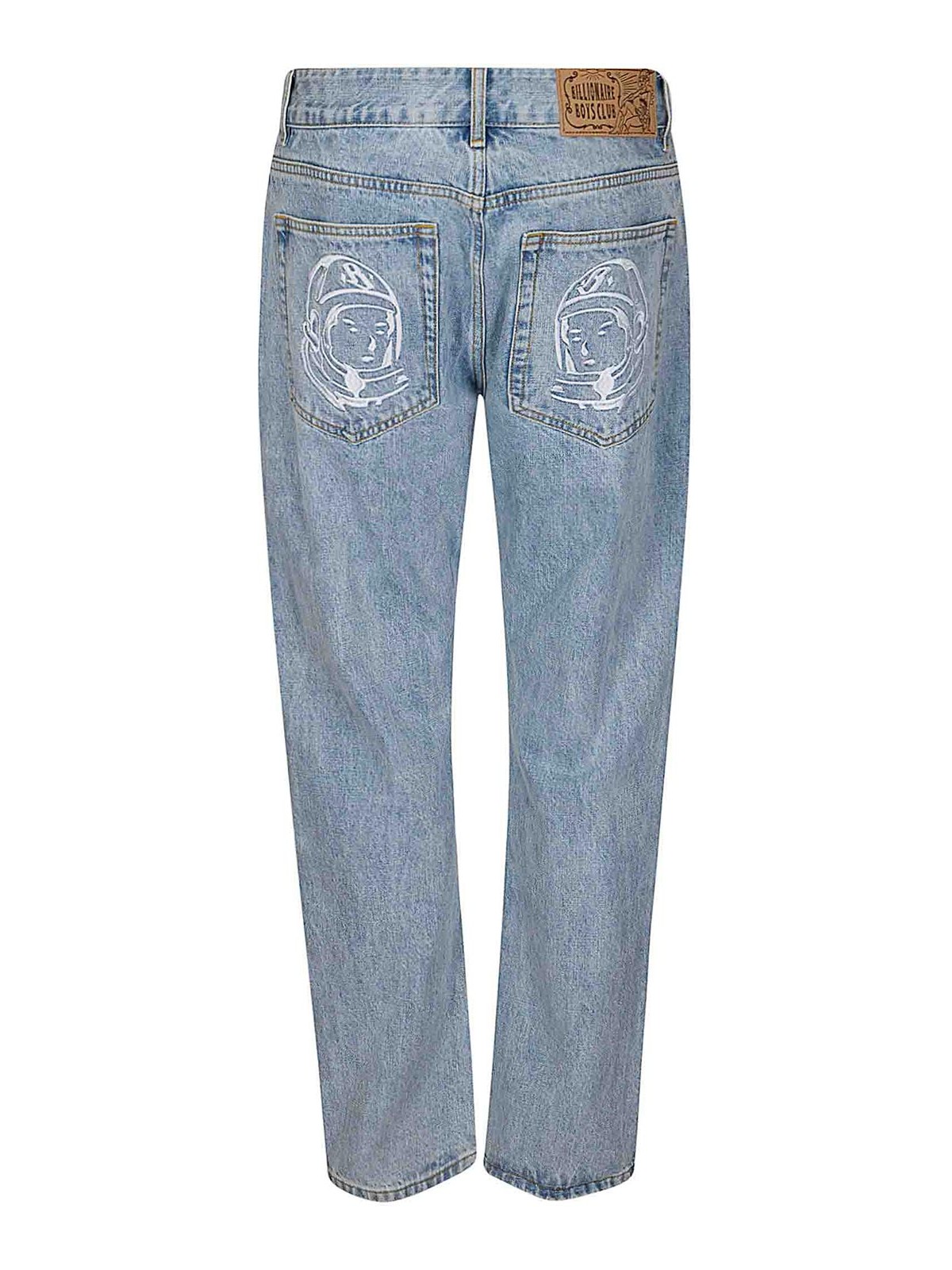ライトウォッシュデニムにコントラストの効いたクラックエフェクトのフロントロゴ、刺繍入りポケット、ストレートレッグ、レギュラーフィット。
