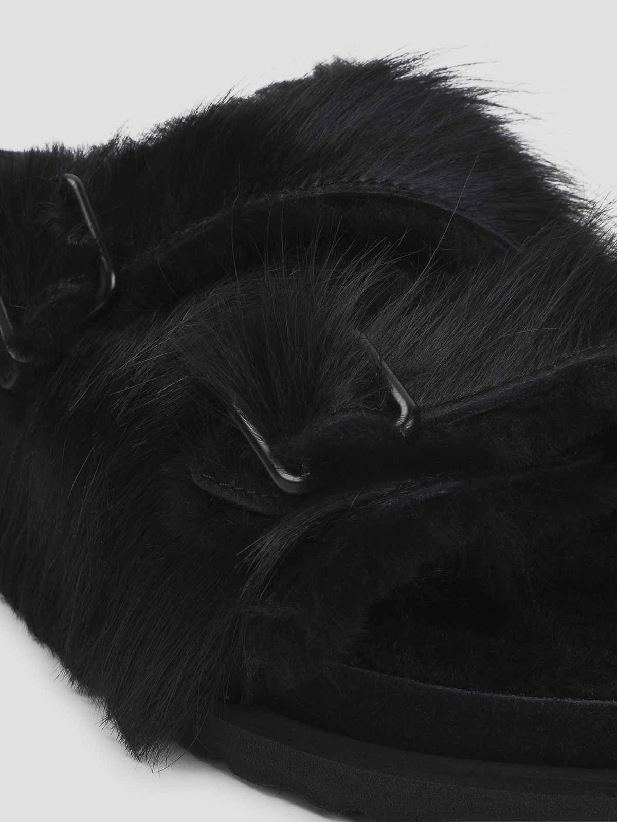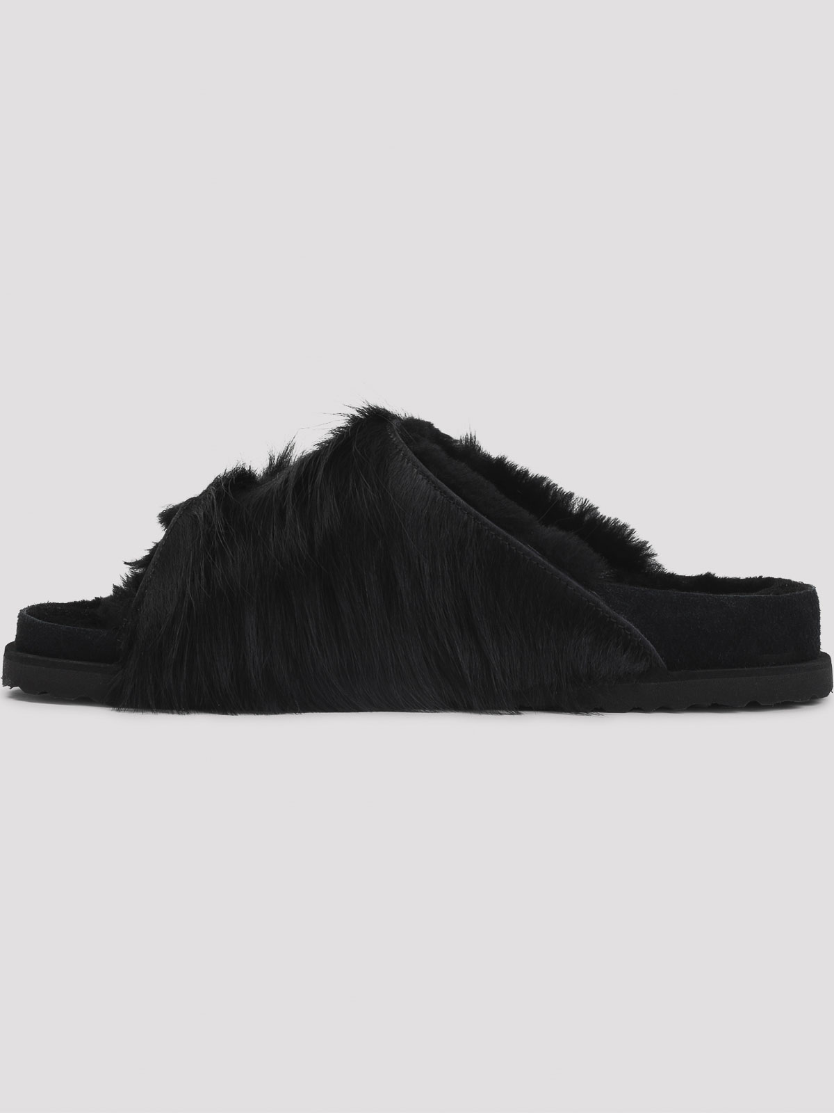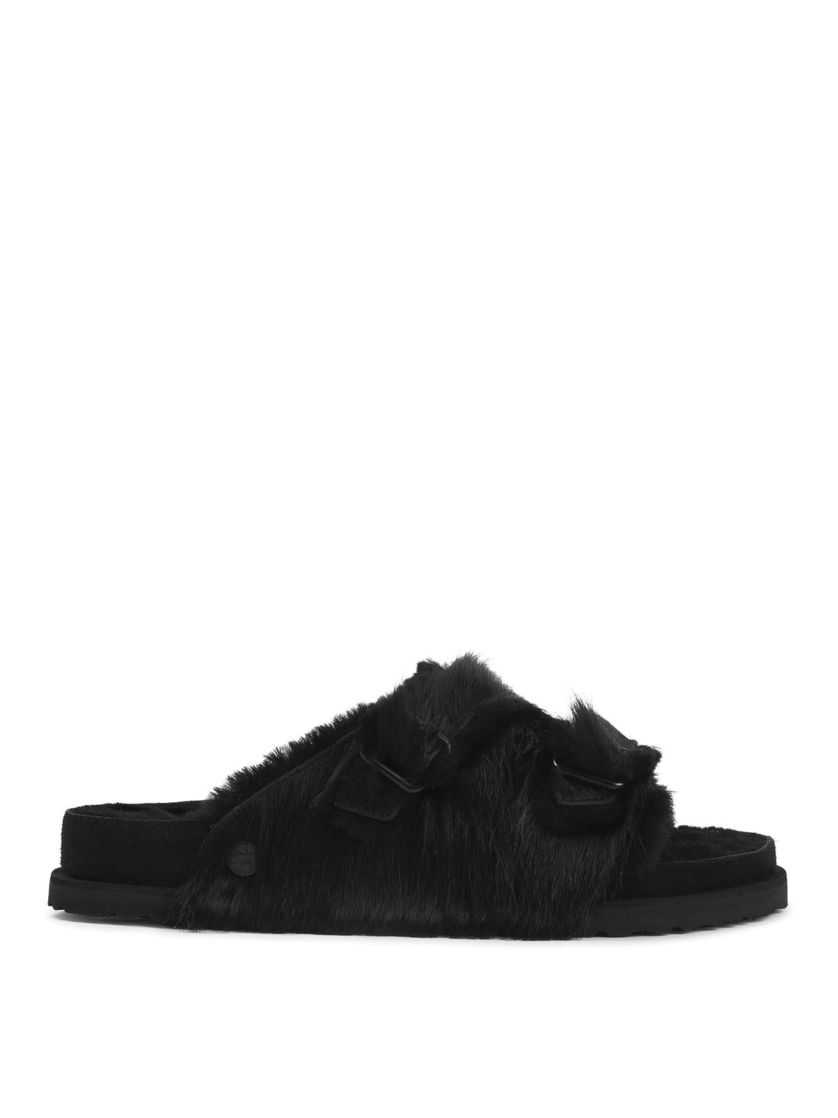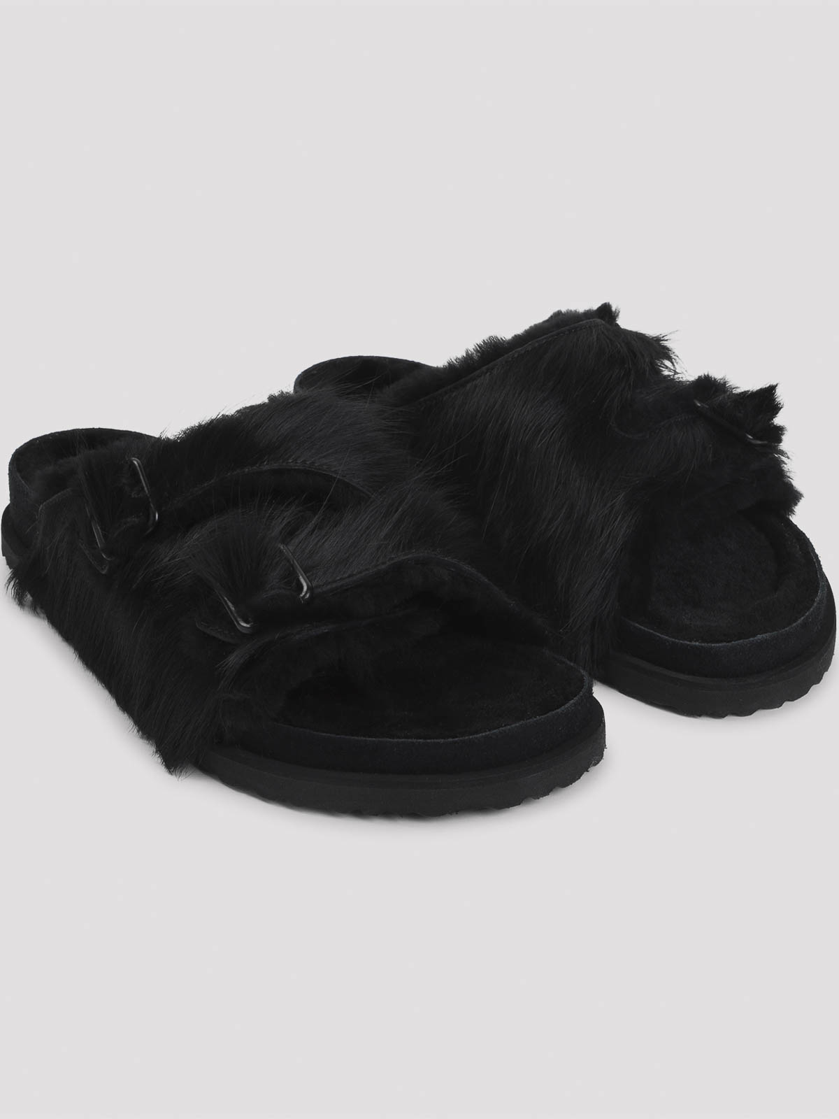 Birkenstock 1774 Zurich ブラックシアリングミュール。ブラックシアリング製で、丸みのあるオープントゥ、ブラックトーンのバックルが付いた調節可能なストラップ2本、サイドにブランドロゴ入りのメタルプラーク、革で覆われた解剖学的に形作られたコルクラテックスのインソール、EVAアウトソールが特徴です。