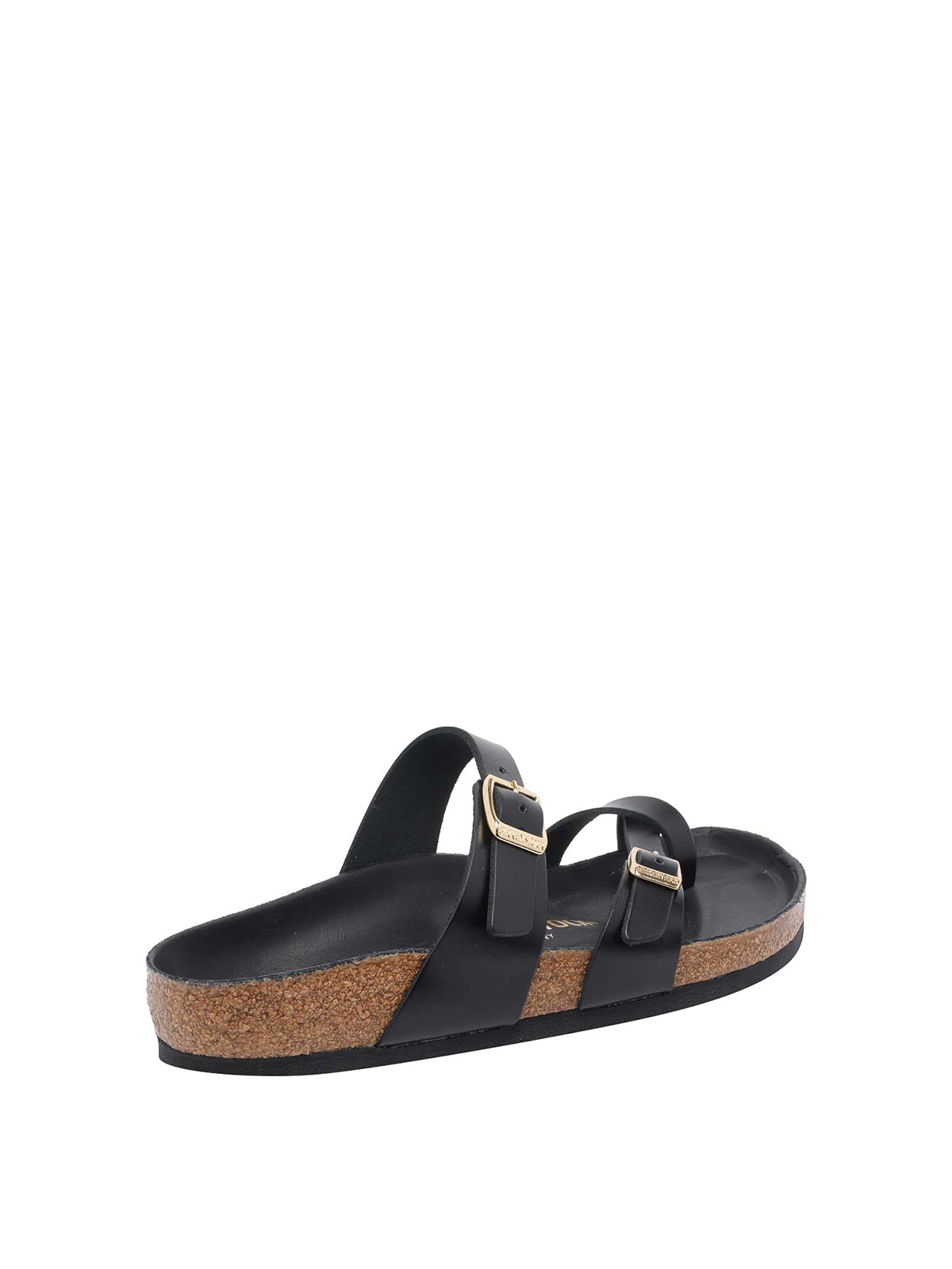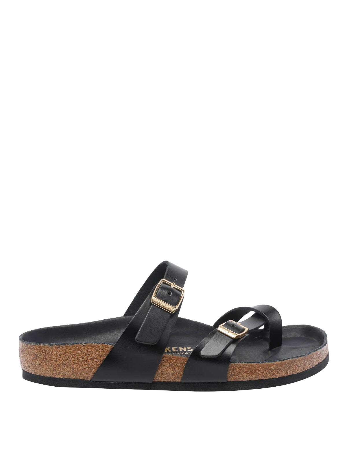 ビルケンシュトックブラックマヤリサンダル、ラウンドトゥ、ラテラルバックル、レザーモデル