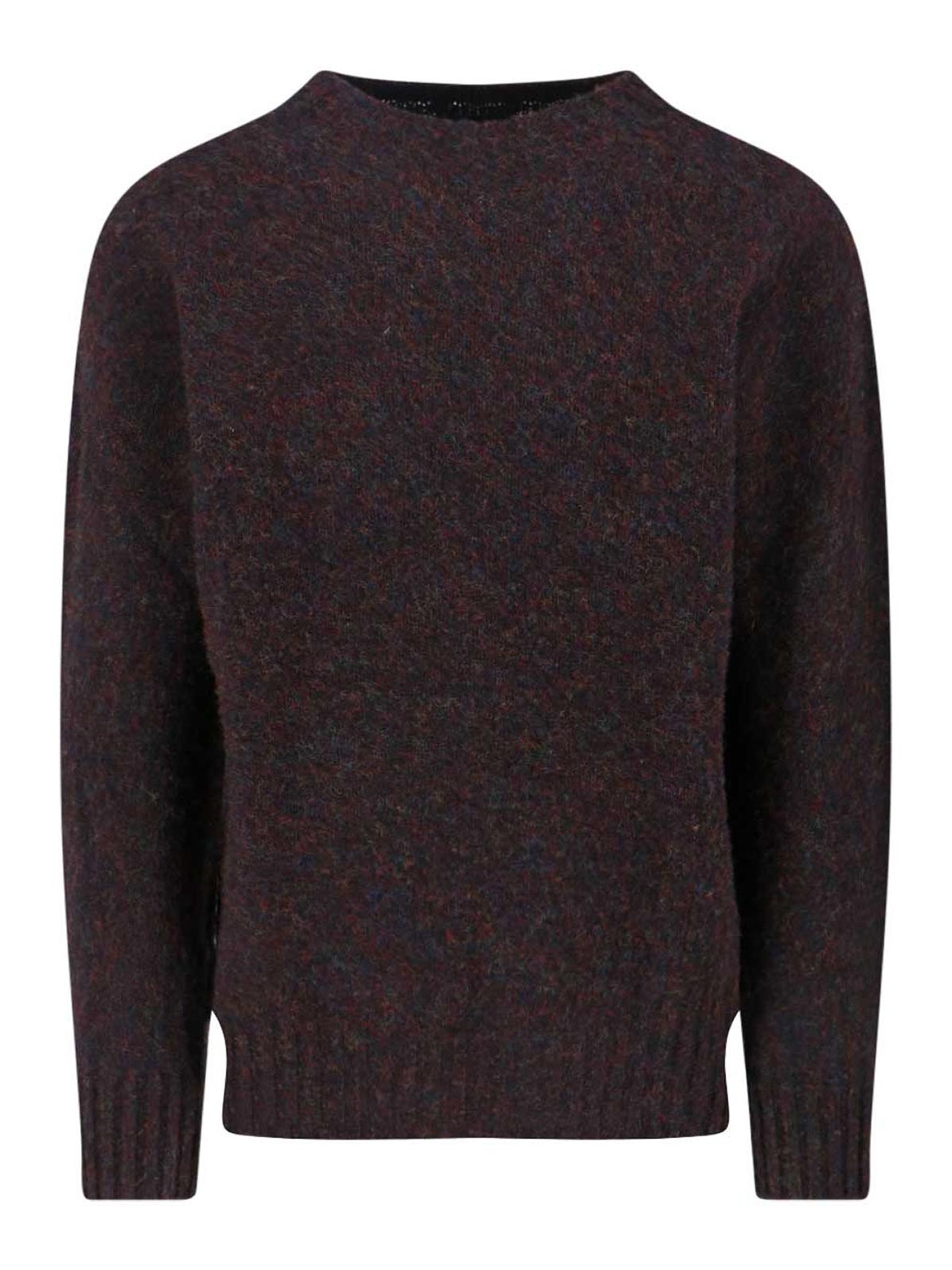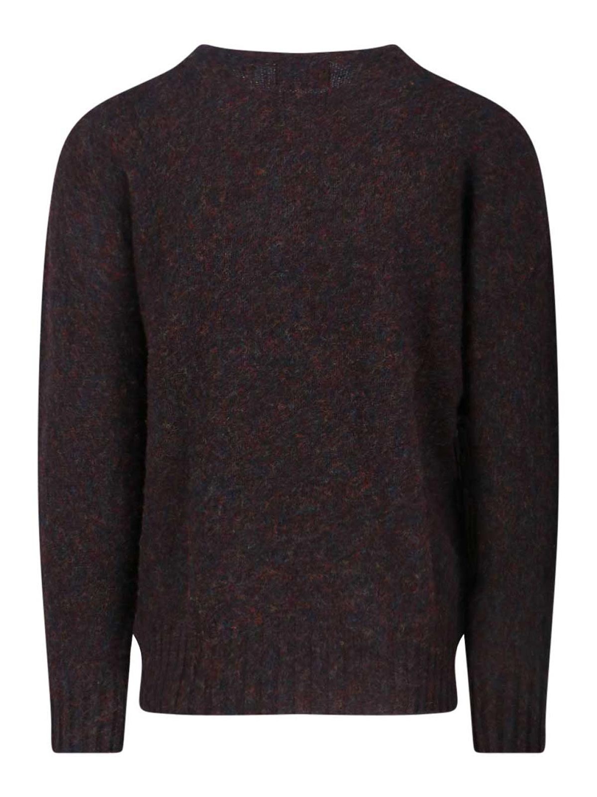 ハウリンが誕生したクールなセーター。ブラウンのファインウール、マルチカラーのディテール、リブ編みのクルーネック、ロングスリーブ、リブ仕上げ、ストレートヘム。