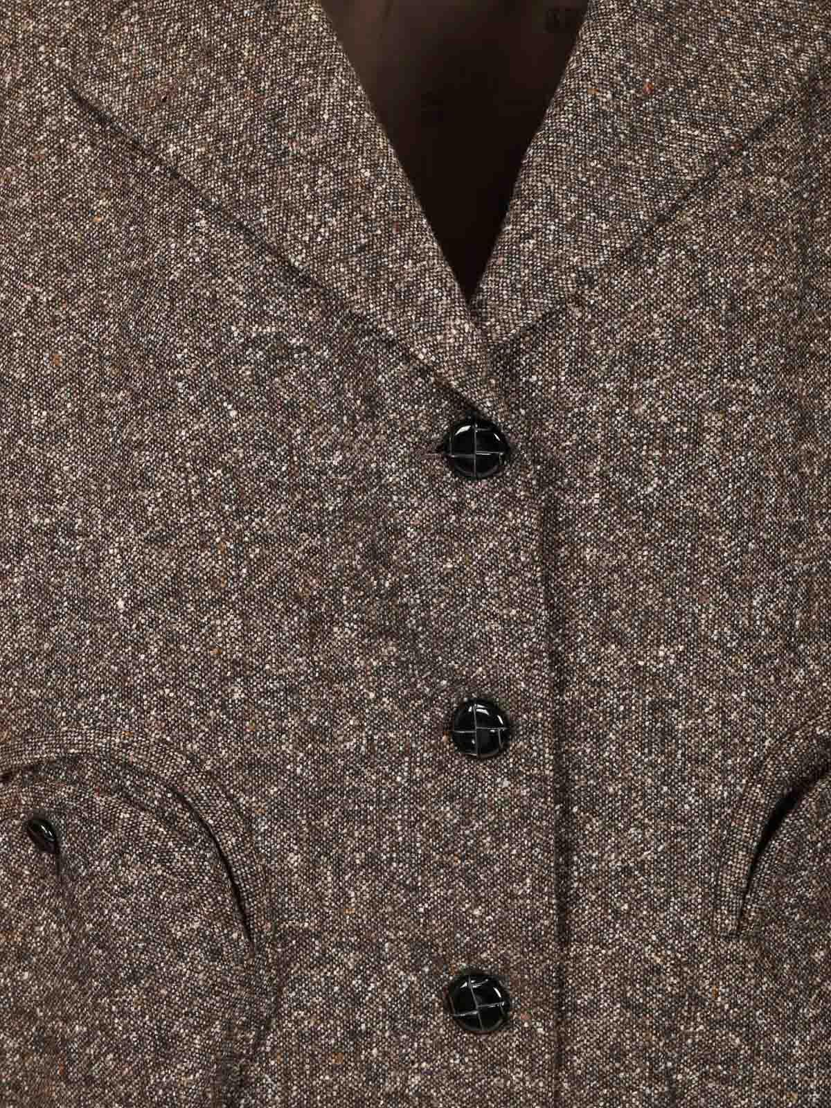 blaz milanoのメランジ生地のチャーリーボンバージャケット。オーバーサイズのシルエットで、裾に伸縮性のあるオーバーサイズシルエット、肩に肩章をあしらったパッド、クラシックなラペル、外側にスマイリーポケット、内側にスマイリーポケット、ブラックのローデンエフェクトボタン、伸縮性のある裾、ダークブラウンのロゴ裏地が付いています。