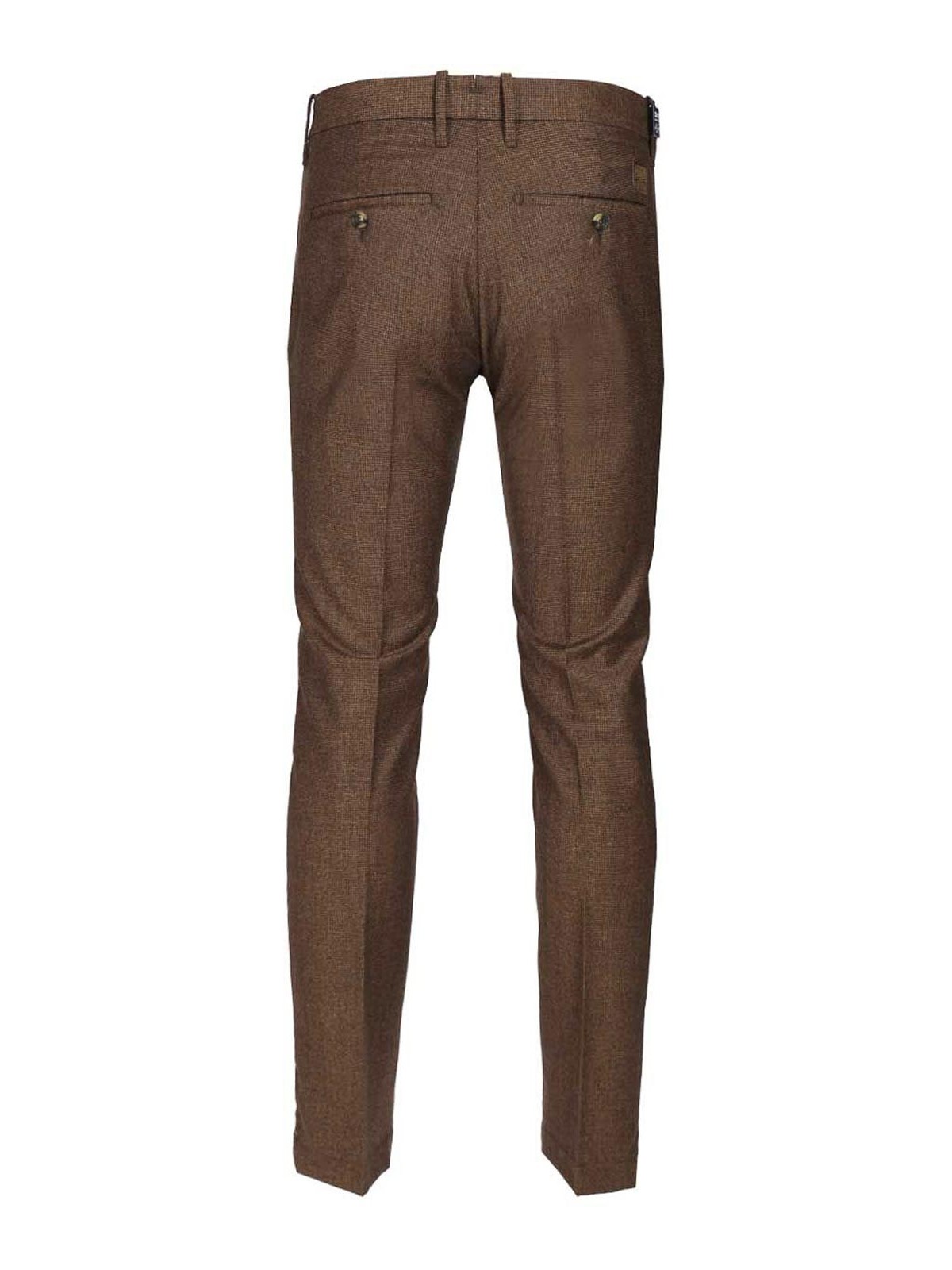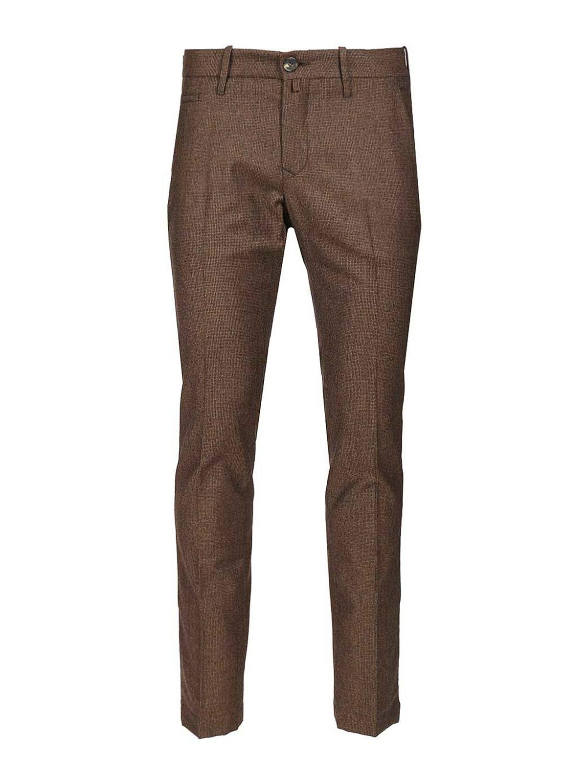 ジェイコブ・コーエンのスリムフィットなボビーチノパンツ。ローライズ、千鳥格子生地、ファスナーとボタン留め、斜めのフロントポケット、後ろにボタン留め付きのウェルトポケット2つ、ウエストにベルトループ、エンボス加工のロゴが入ったスエードラベルが付いています。
