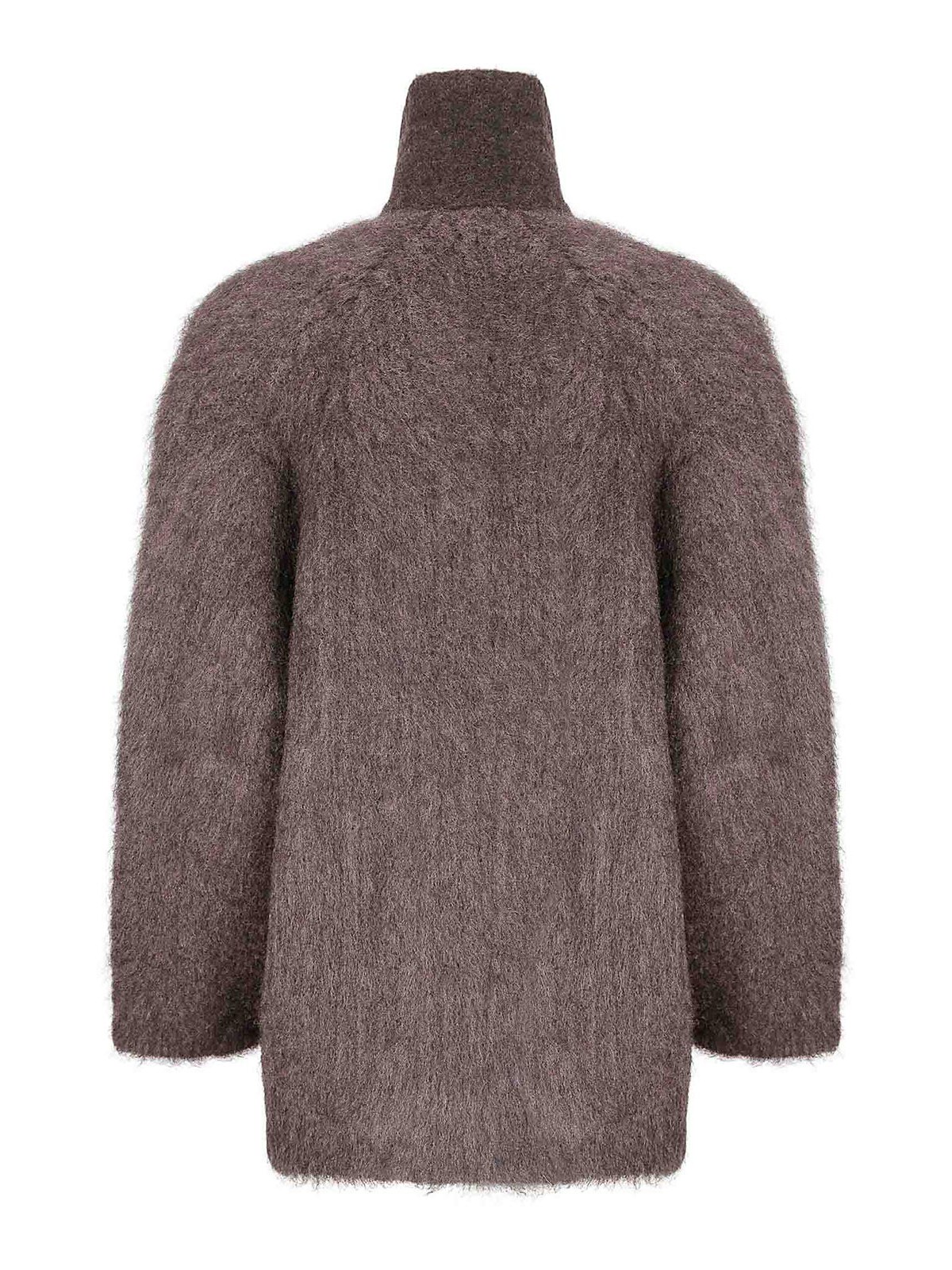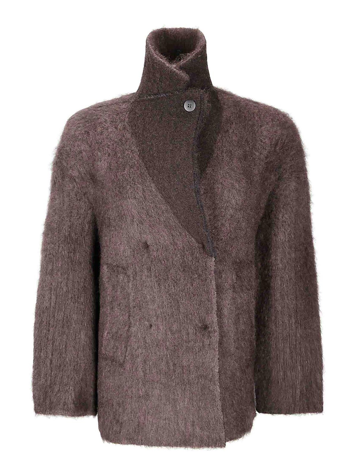 ダブルブレストのボタン留め、2つのサイドウェルトポケット、ニットデザインのジャケット。