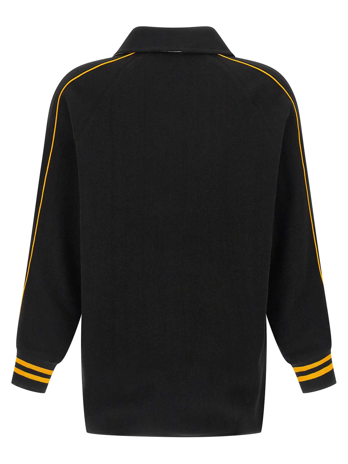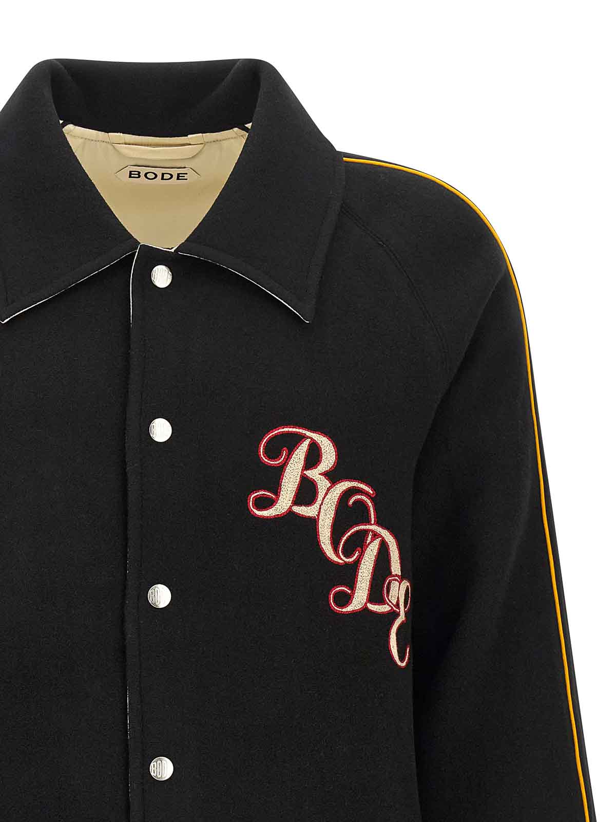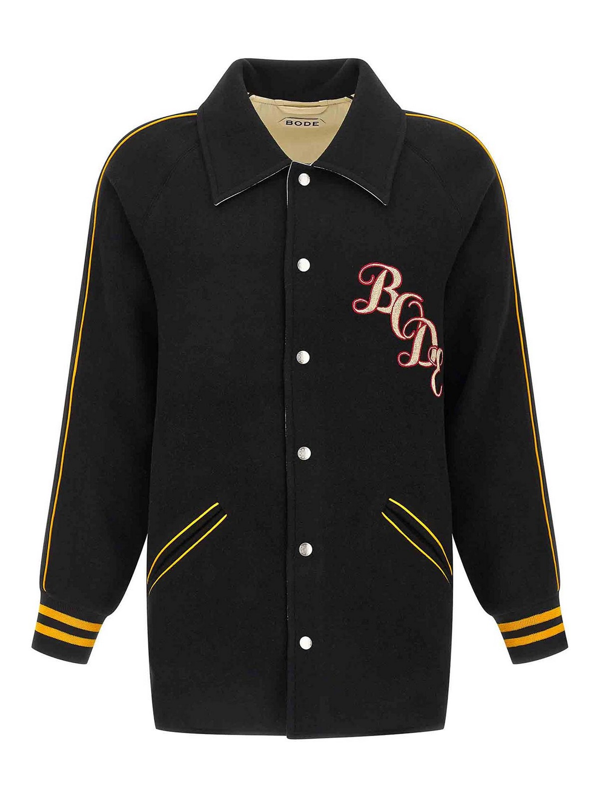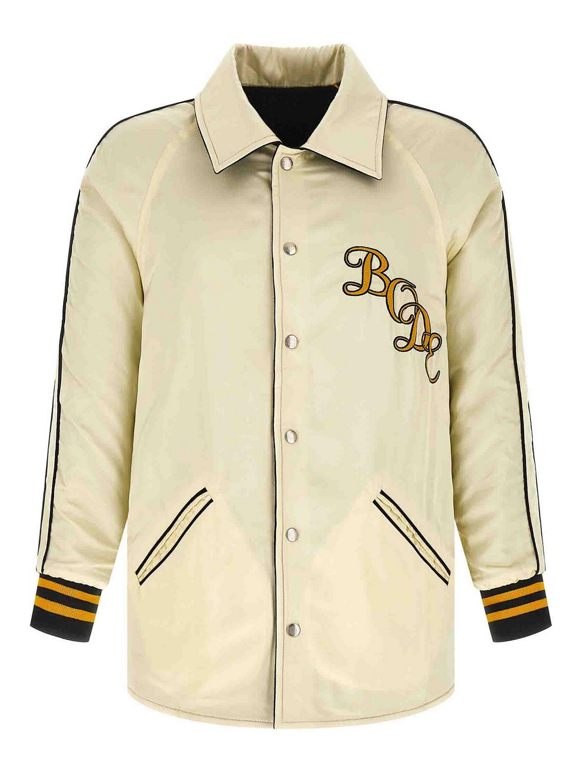 コントラストの効いたディテールをあしらったモノグラムスナップのリバーシブルフェルトとサテンのジャケット。60年代のカレッジジャケットを再現し、フロントチェーンのロゴ刺繍、シャツの襟、スナップボタン留め、ポケット、ニットカフスとドロップショルダーをあしらったロングスリーブ。