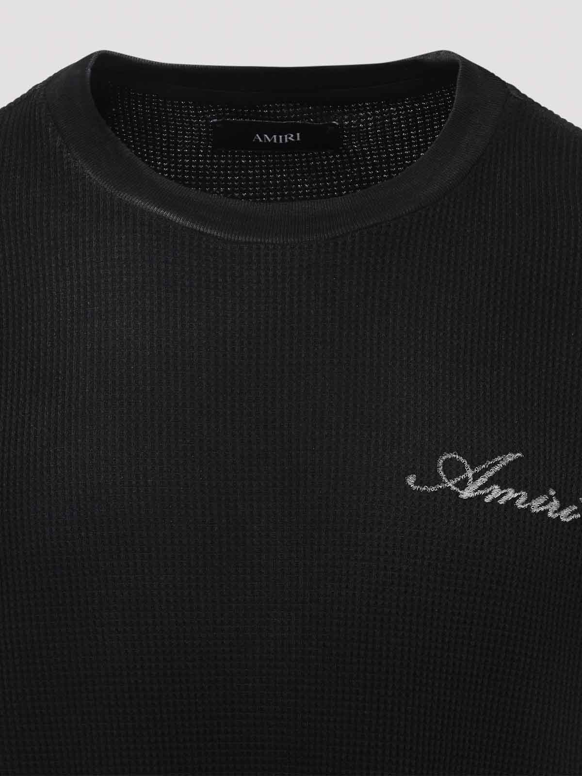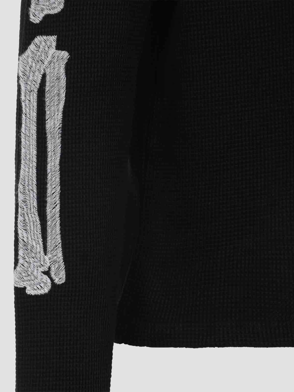 Amiri ブラックコットンボーンロングスリーブ T シャツ。ピュアブラックコットンTシャツ、ラウンドネック、胸元コントラストの効いた白い刺繍ロゴ、長袖、袖にコントラストホワイトのボーンディテール、リブ編みのカフス、ストレートヘム。