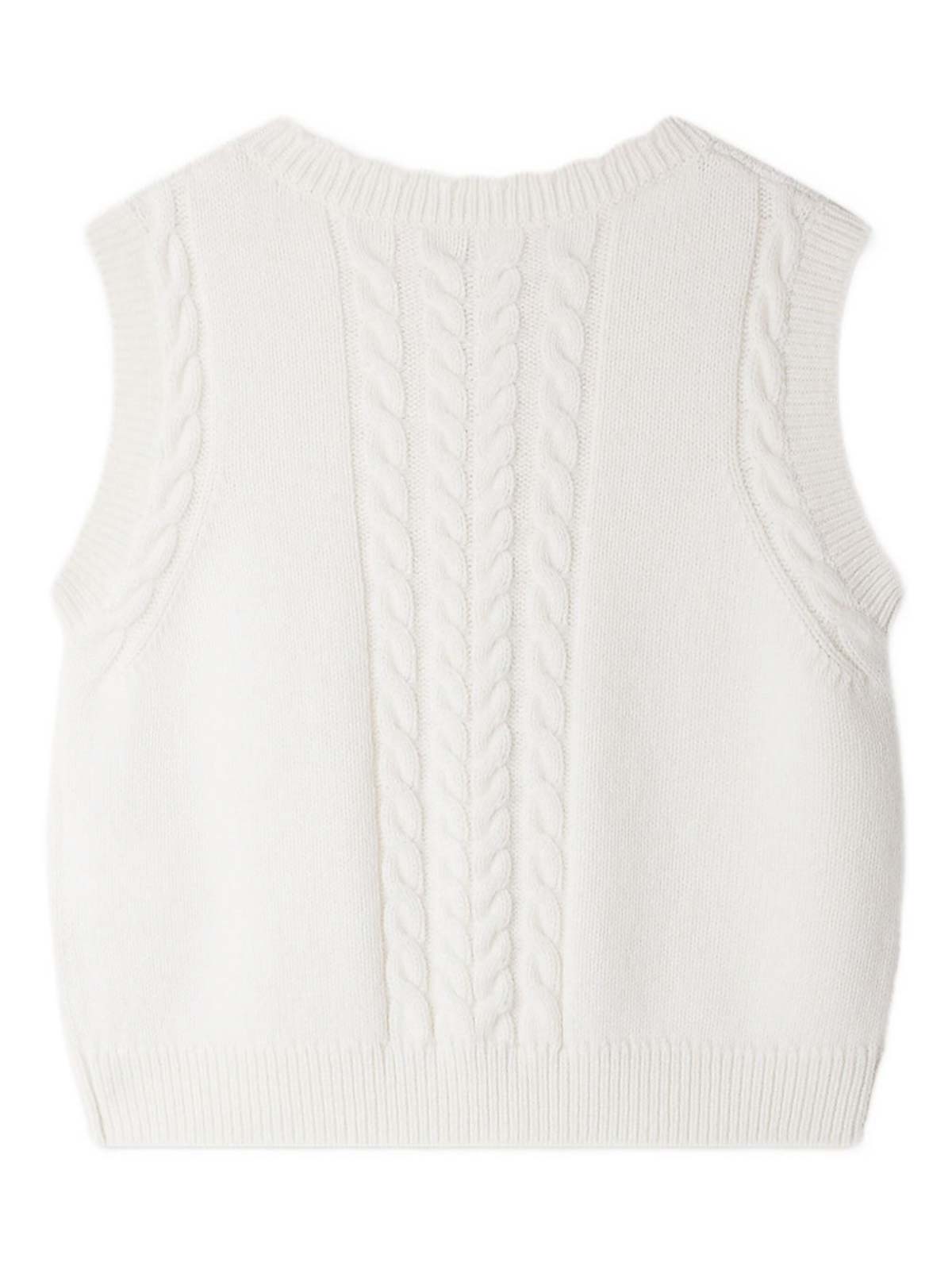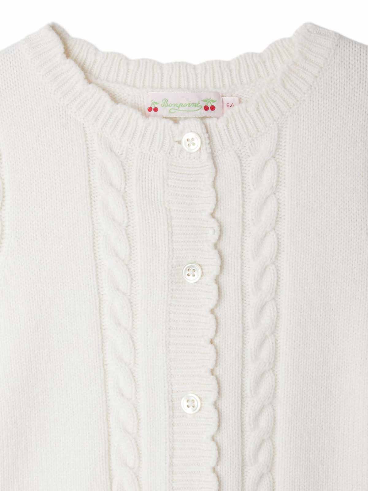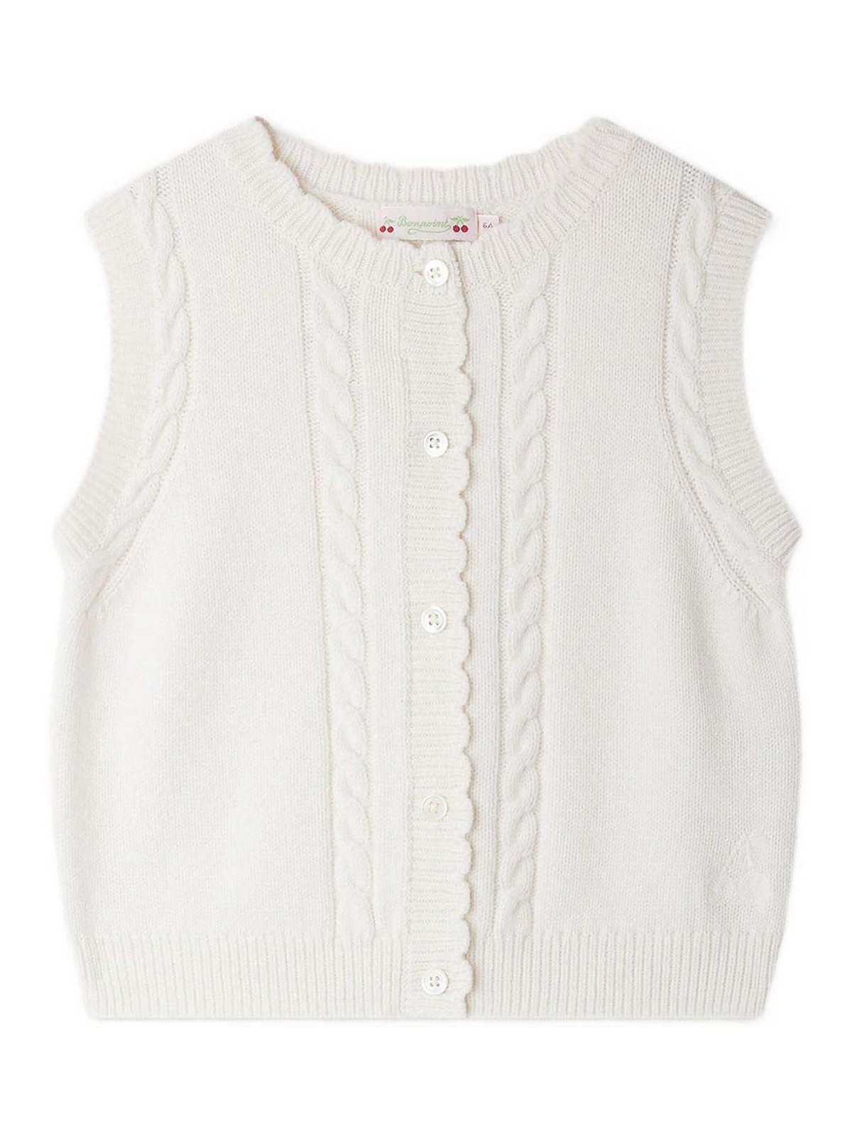 Bonpoint kidsの女の子用ノースリーブカーディガン。ケーブルニット、ボタン、リブ編みのトリムが付いた白色で、小さなお子様のルックスをかわいく仕上げるのに最適です。ボンポイントキッズノースリーブカーディガン、白いボタン付きケーブルニットリブ編みの袖口、柔らかく快適