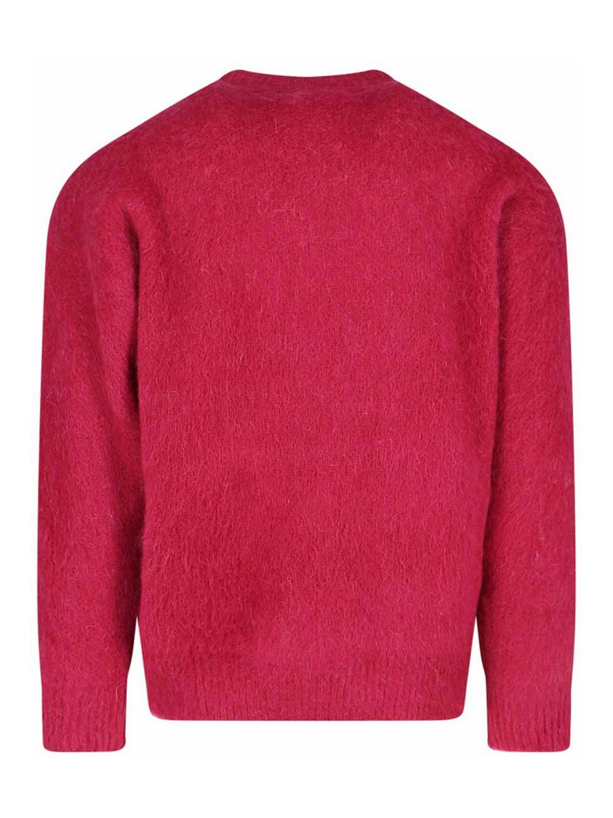 盆栽モヘア混紡セーター、レッド、クルーネック、コントラストの効いたライトブルーの刺繍ディテール、リブ仕上げ、ストレートヘム。