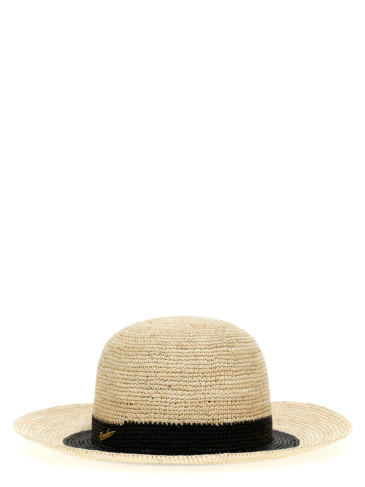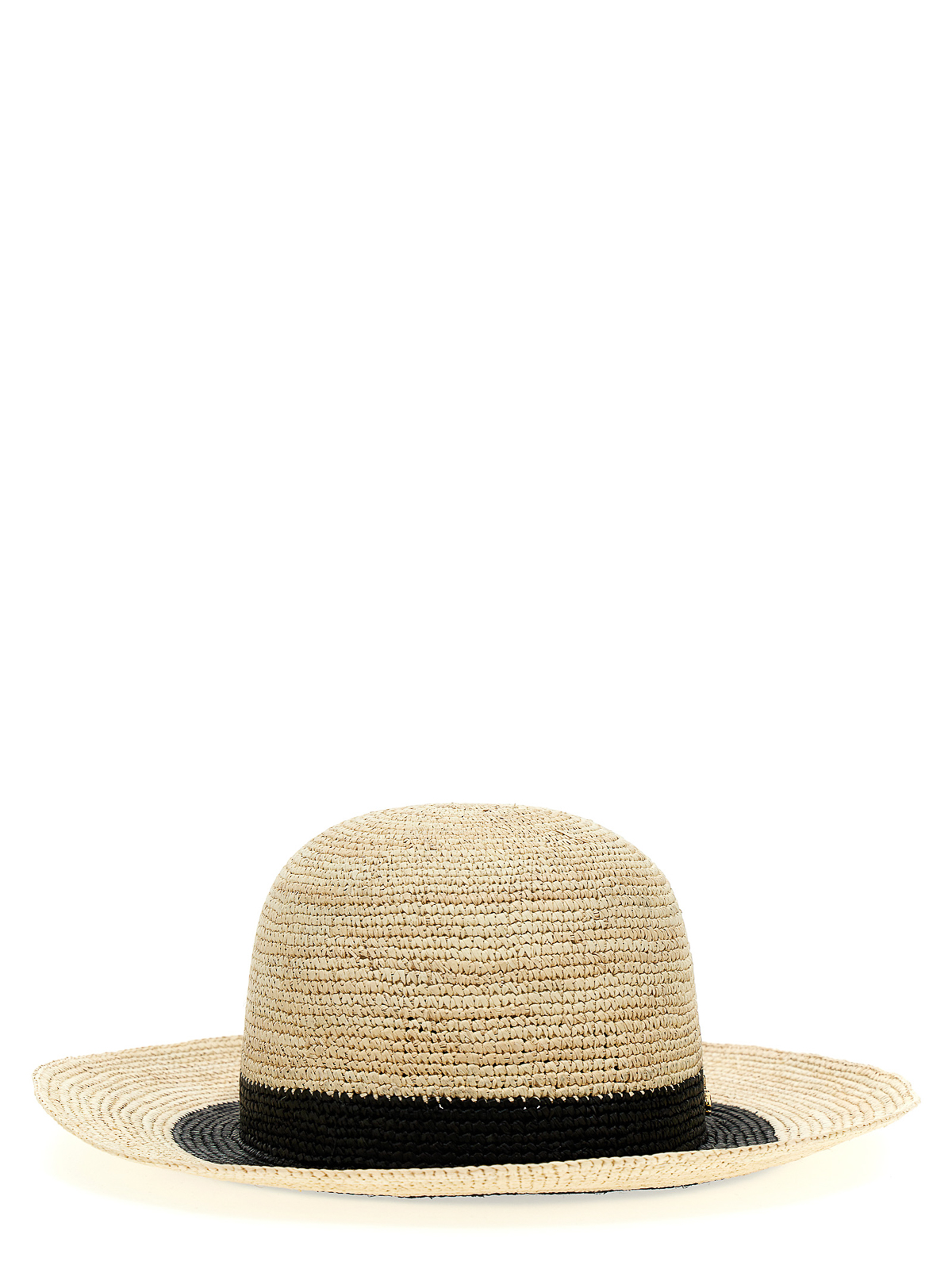 コントラストとメタルロゴの施されたパナマのかぎ針編みの麦わら帽子