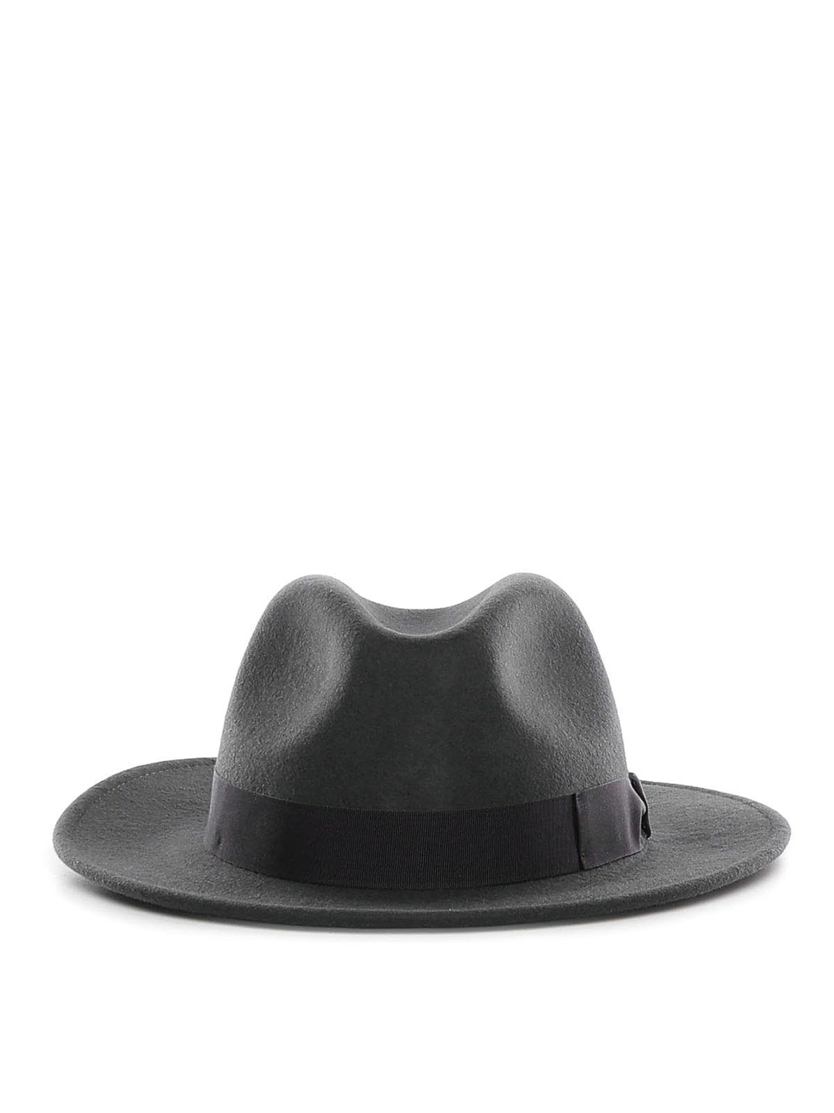 ウールフェルト製、ミディアムブリム、トーン・オン・トーンのロゴ入りグログランバンド、裏地なし、イタリア製、色:グレー