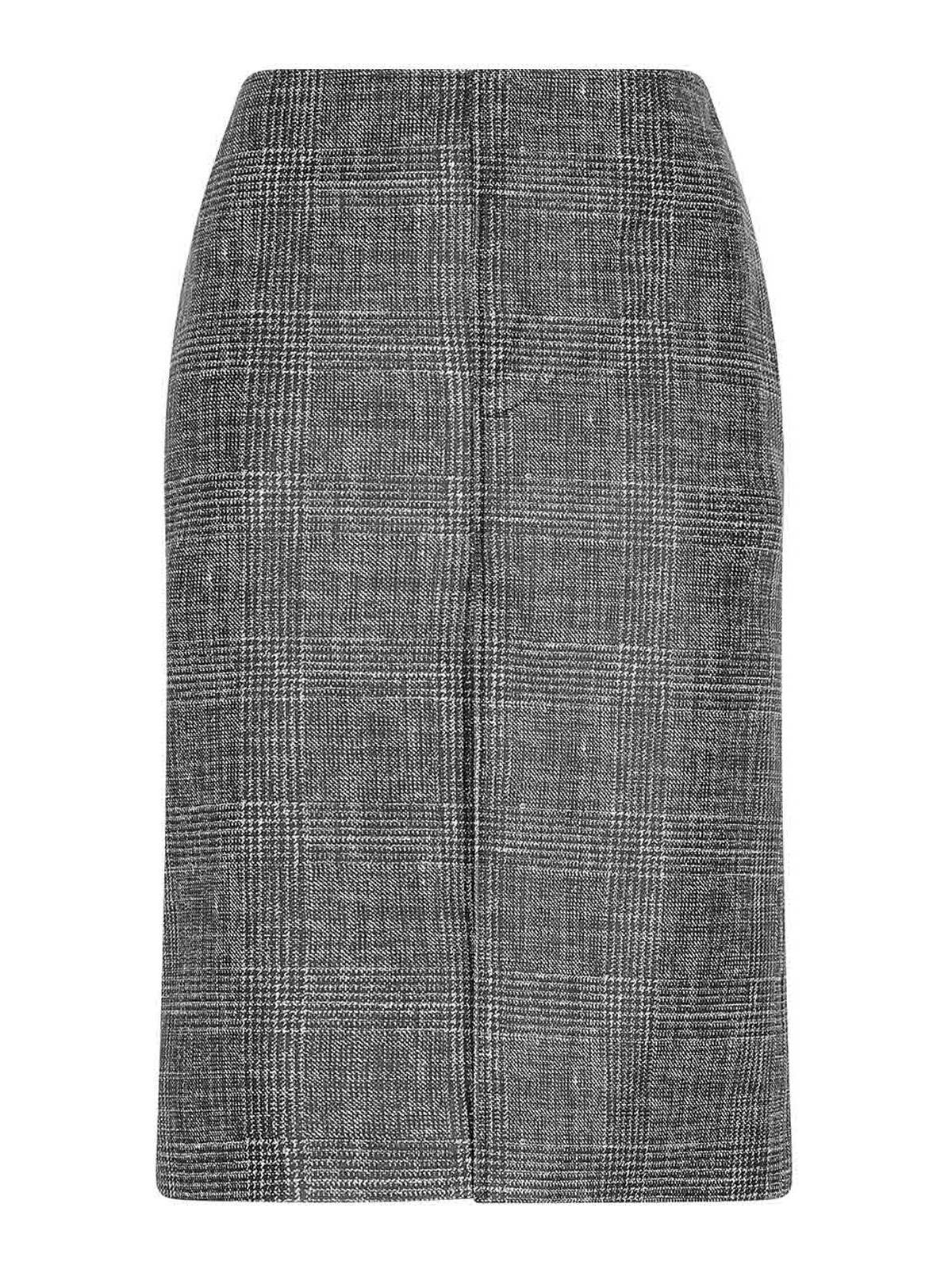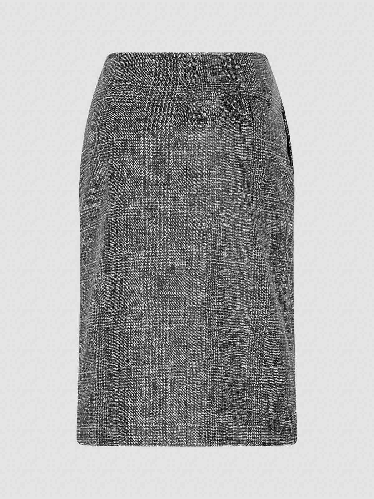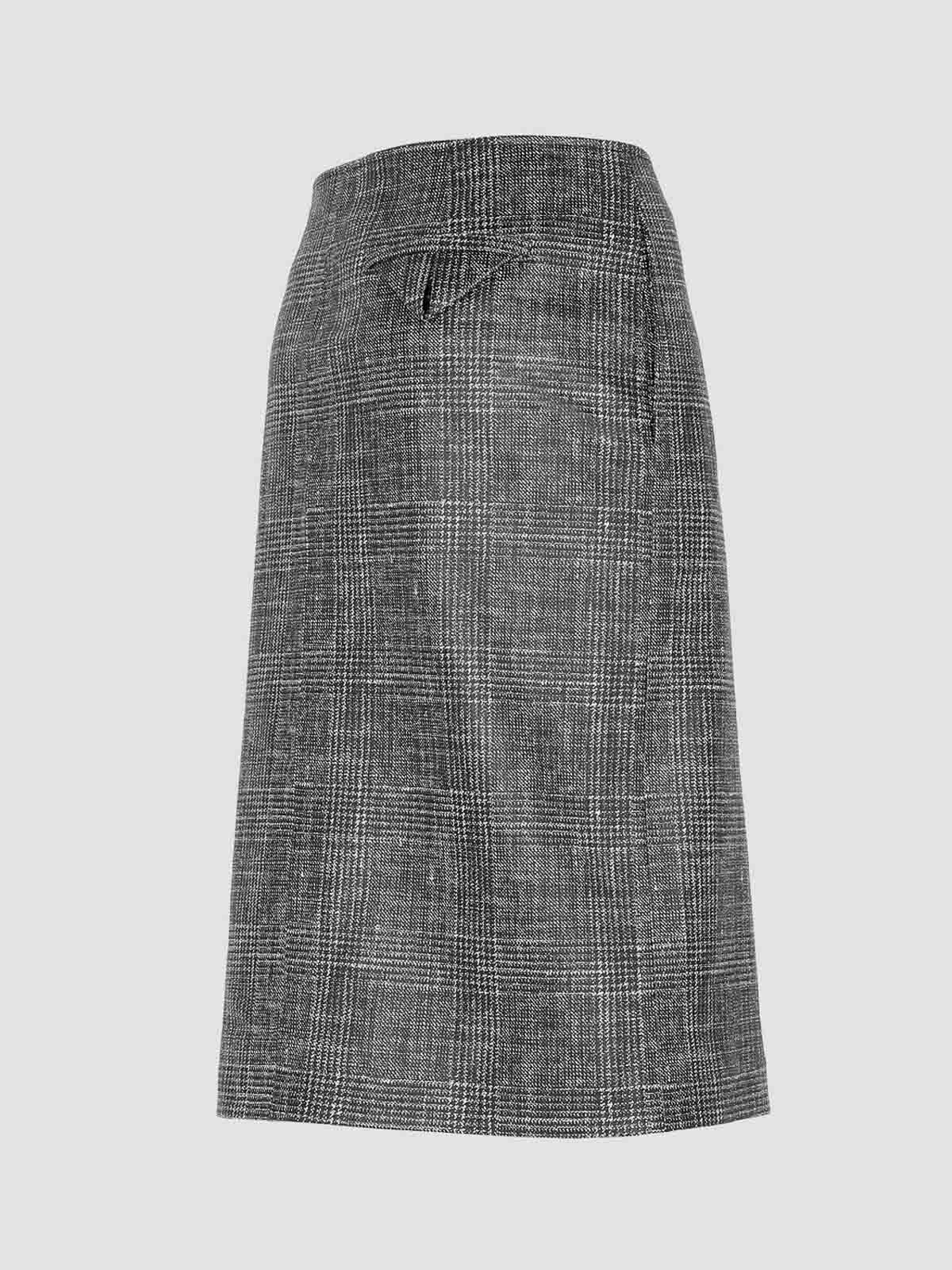 Bottega veneta ブラックプリントレザーミディスカート。黒と白のプリンスオブウェールズのチェック効果のあるピュアラムレザー製。フロントコンシールファスナー、サイドスリットポケット、シグネチャートライアングルフラップ付きバックポケット、フロントスリット、ミディ丈、ストレートヘム、裏地なし。