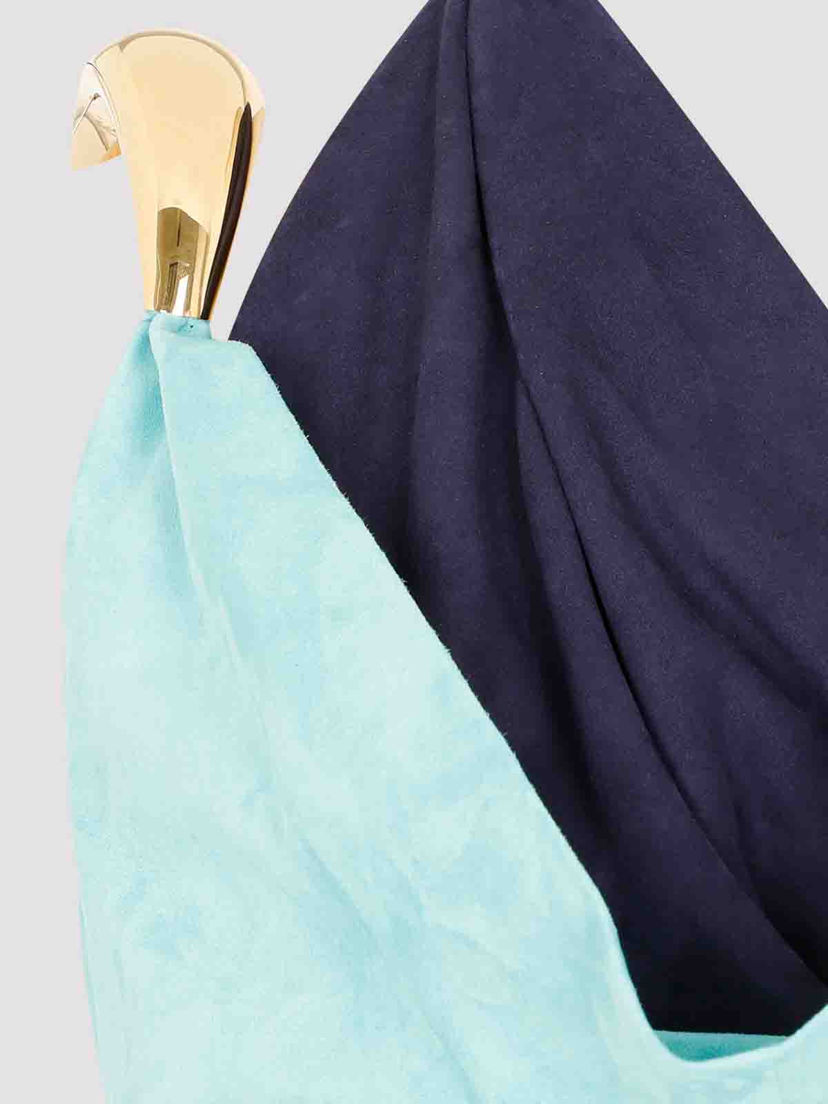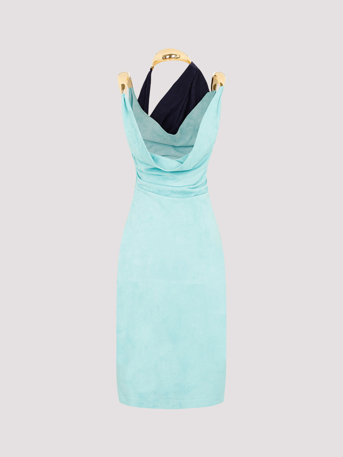 メタルディテールをあしらったボッテガ・ヴェネタブルーのフルイドスエードミディドレス。ネイビーブルーのディテールをあしらったピュアセラドンターコイズスエードレザー製。ショールネック、ネックバックに金色の金具の装飾が施されたアシンメトリーなフロントパネル、ノースリーブ、金色の金具のディテールが施されたショルダーストラップ、フロントドレープ構造、ローバック、見えないサイドファスナー、ミディ丈、ストレートヘム、裏地なし。