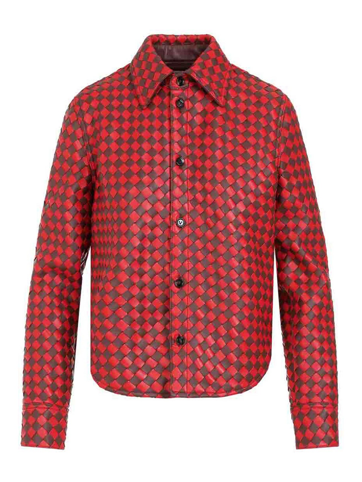 Bottega veneta バイカラーイントレチャートブラウンベリースカーレットレザーシャツ。イントレチャートブラウンとレッドのラムレザー製、シャツカラー、フロントボタン留め、ボタン付きカフス、ラウンドヘム、裏地なし。